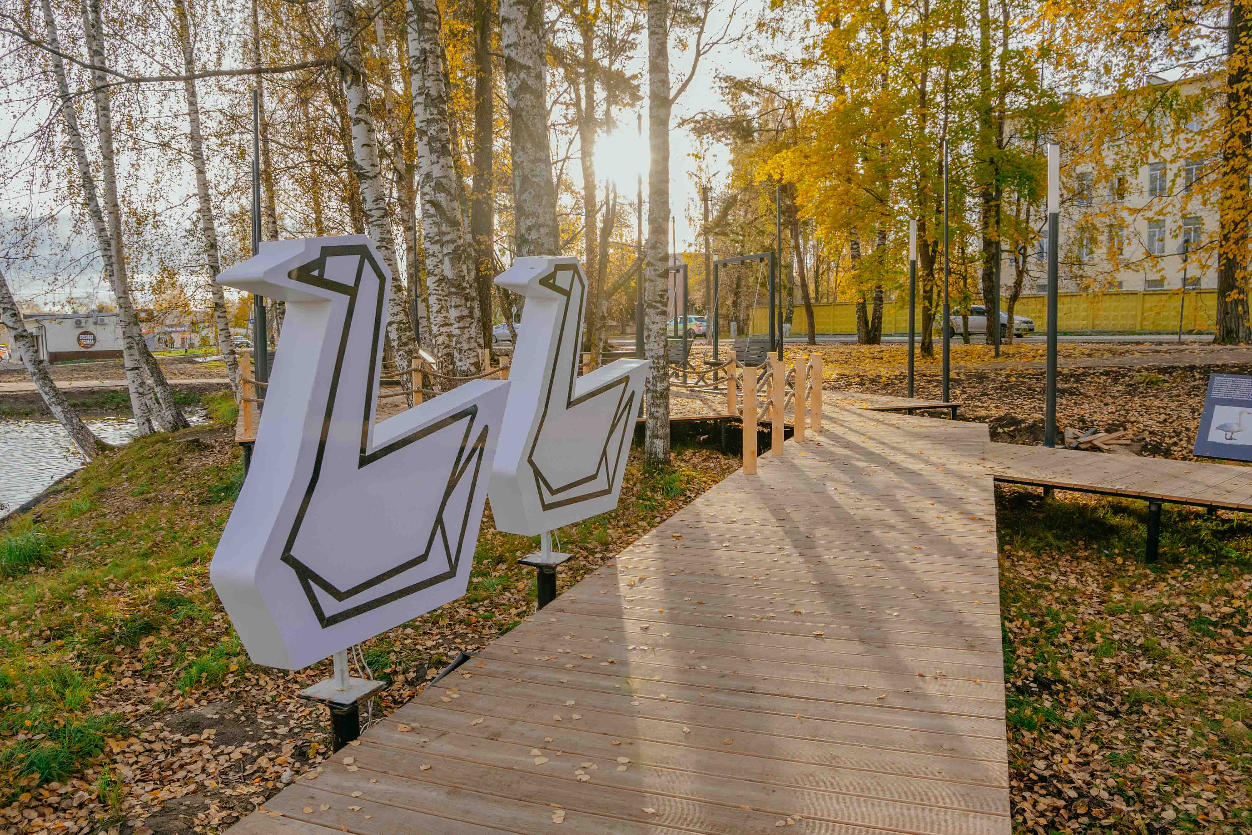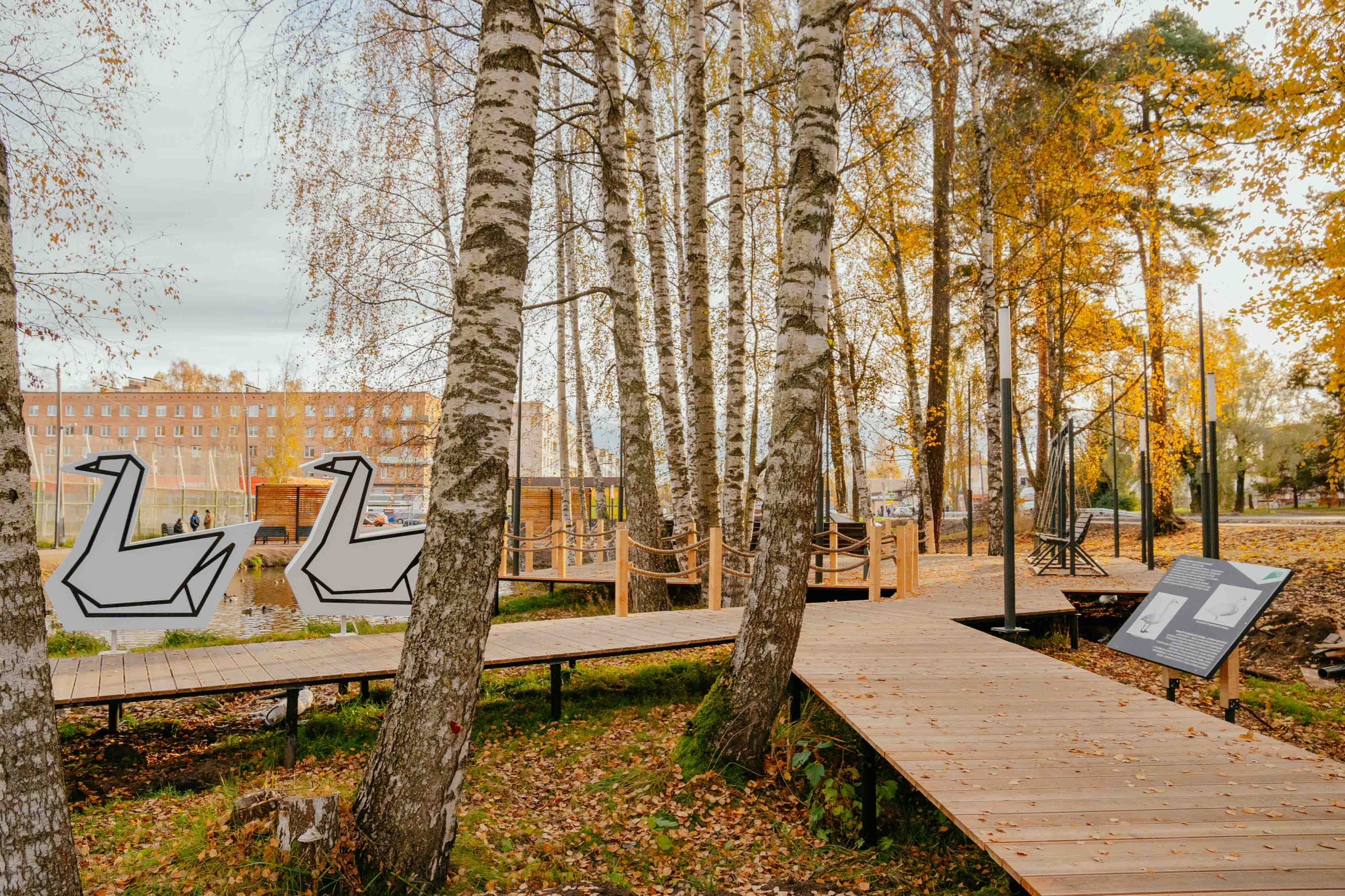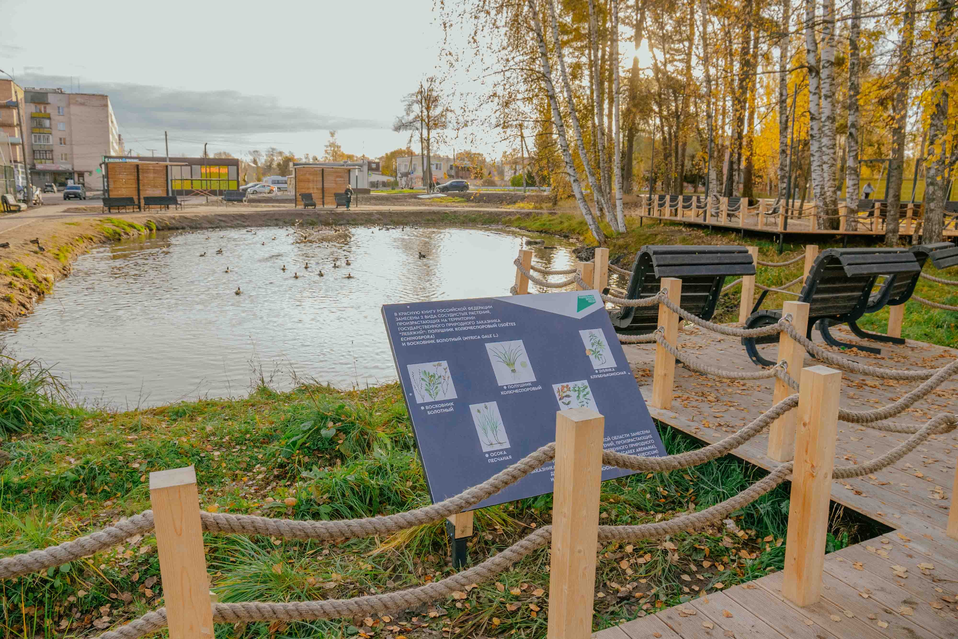 Целью проекта стало сохранение природных особенностей места (березы,пруд с лилиями) и интеграция нового общественного пространства в уже существующую инфраструктуру поселения. Проект создает комфортную, и безопасную среду для различных групп пользователей. На территории оборудованы пешеходные дорожки, идущие по существовавшим пешеходным маршрутам, организовано энергоэфективное освещение с учетом различных зон. Для жителей устроены рекреационные зоны с видом на воду. Изюминкой территории станет световой арт-объект Лебедь - символ Лебяженского г.п. Арт-объект выполнен из белого пластика с LED- подсветкой и имеет антивандальную конструкцию.