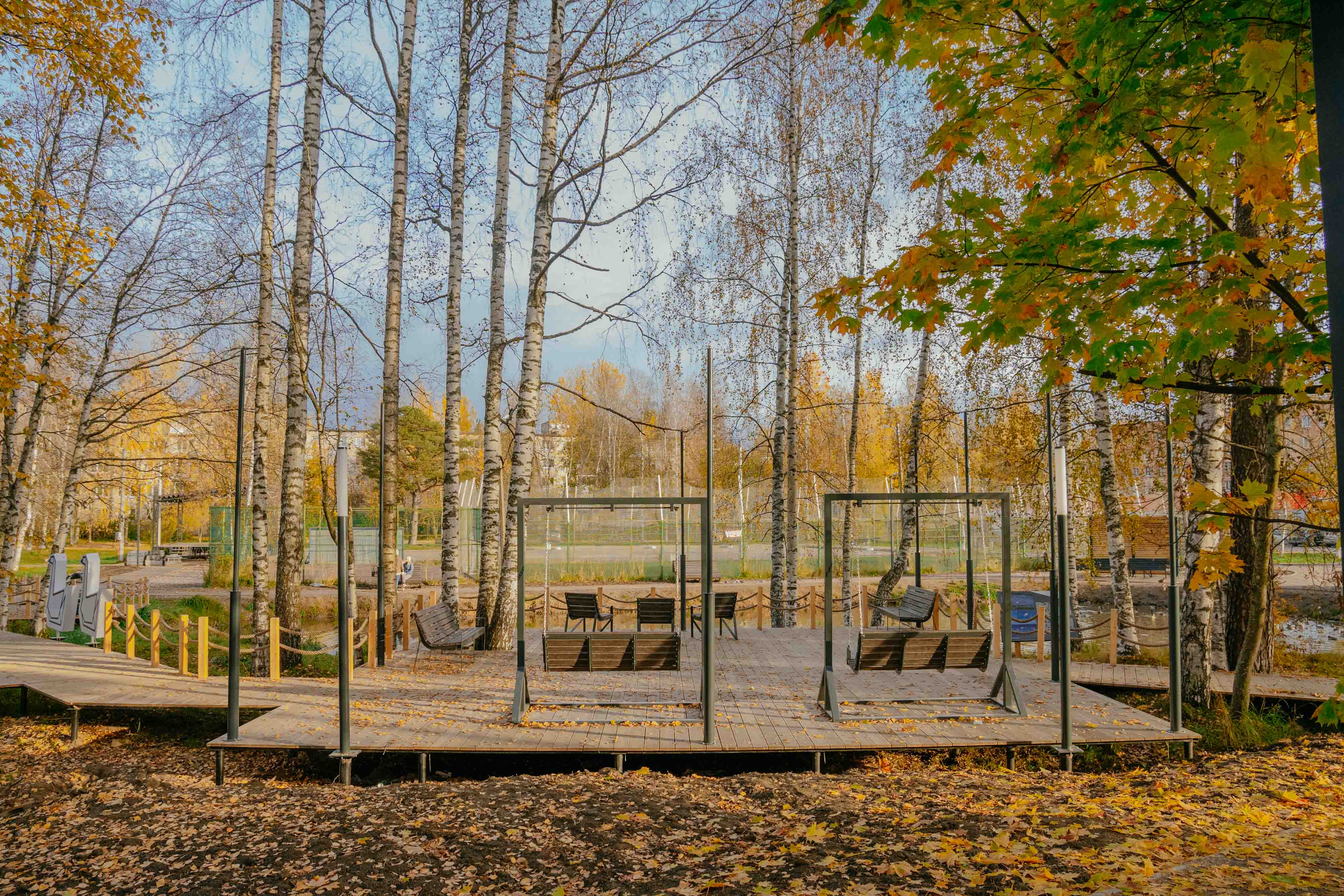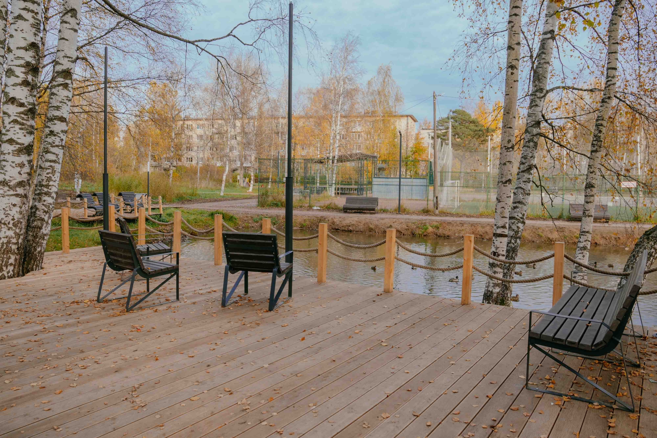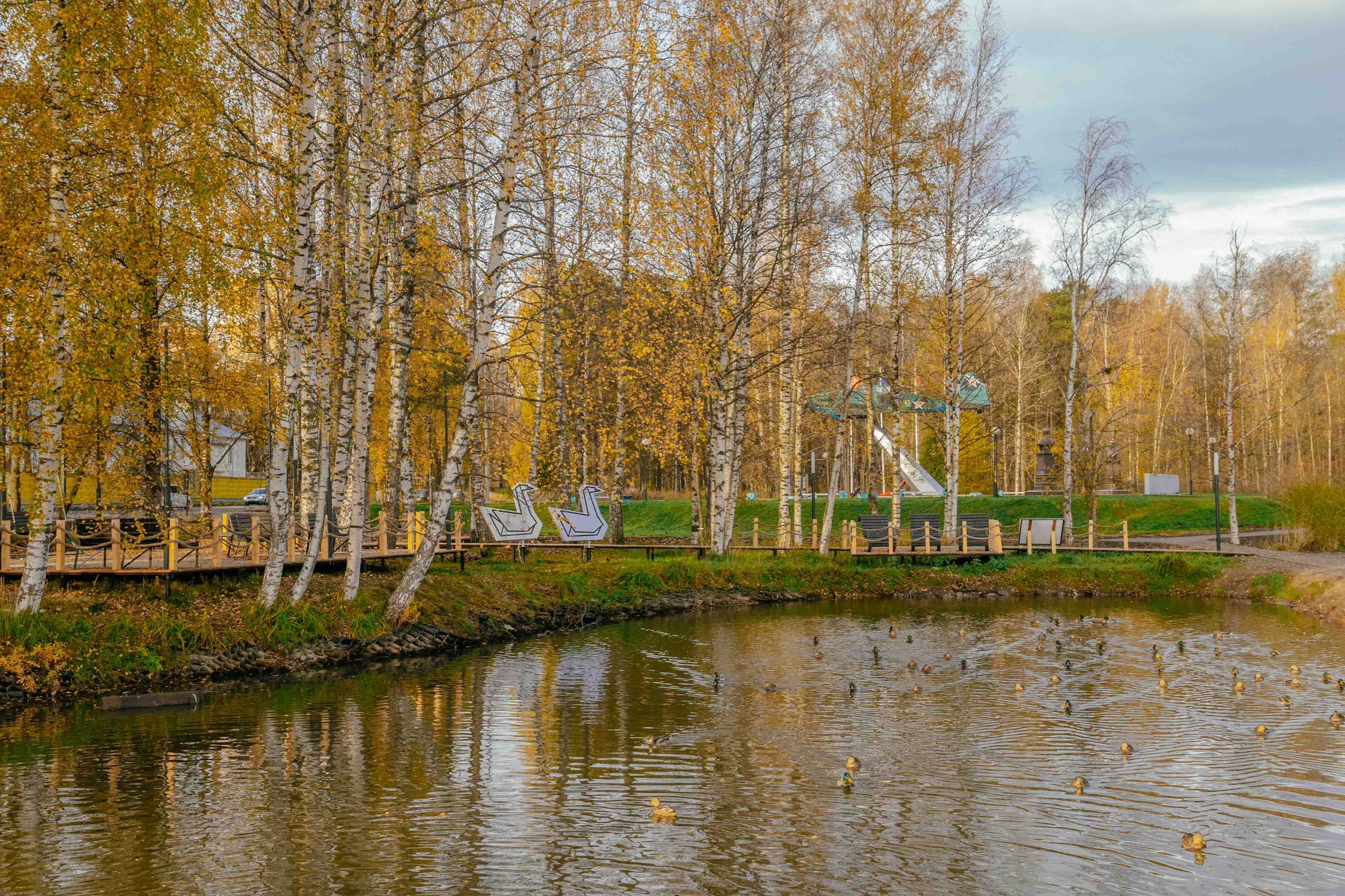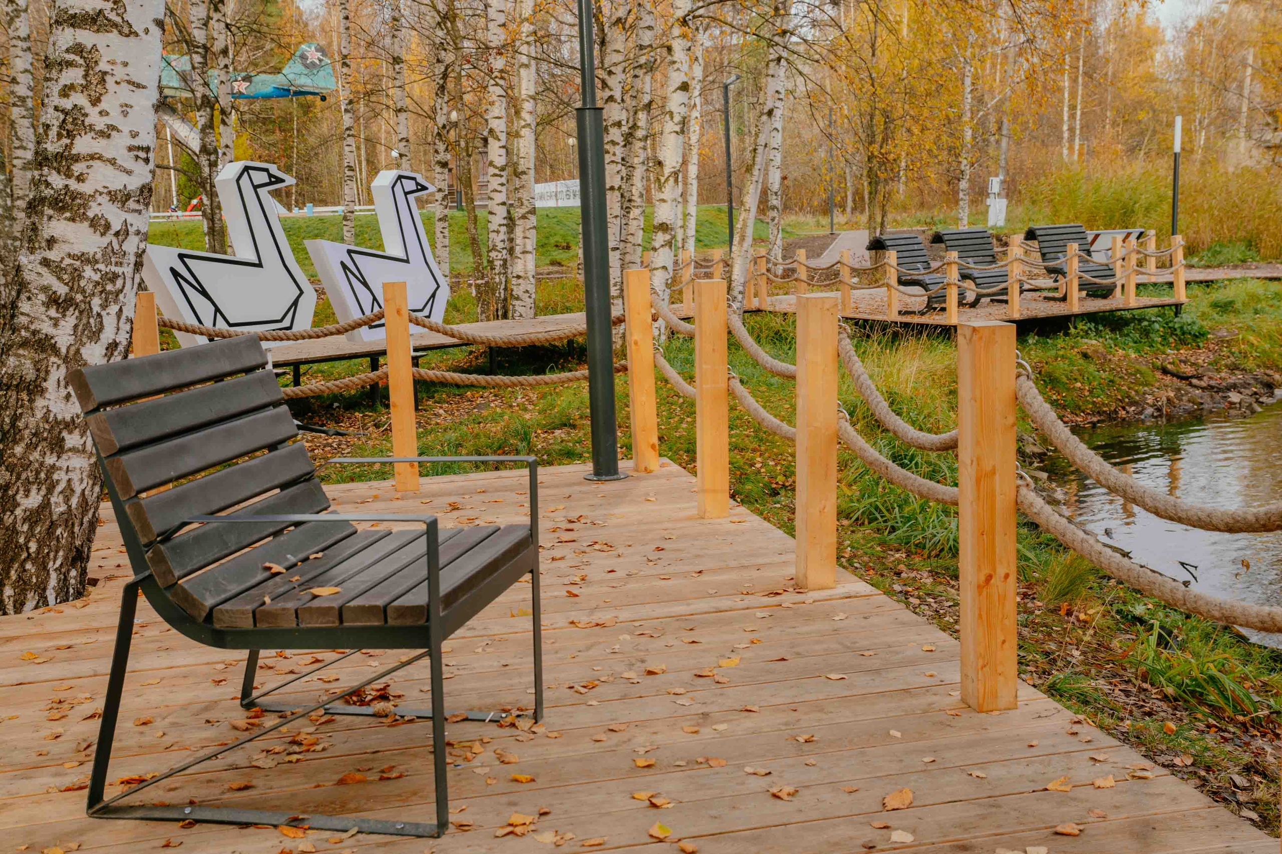 Целью проекта стало сохранение природных особенностей места (березы,пруд с лилиями) и интеграция нового общественного пространства в уже существующую инфраструктуру поселения. Проект создает комфортную, и безопасную среду для различных групп пользователей. На территории оборудованы пешеходные дорожки, идущие по существовавшим пешеходным маршрутам, организовано энергоэфективное освещение с учетом различных зон. Для жителей устроены рекреационные зоны с видом на воду. Изюминкой территории станет световой арт-объект Лебедь - символ Лебяженского г.п. Арт-объект выполнен из белого пластика с LED- подсветкой и имеет антивандальную конструкцию.