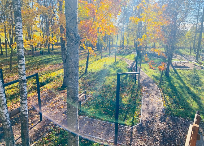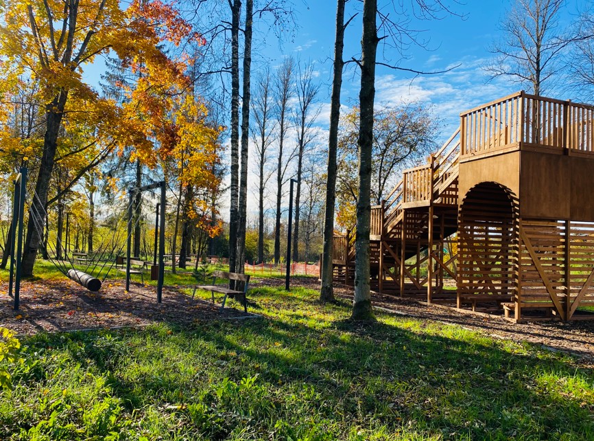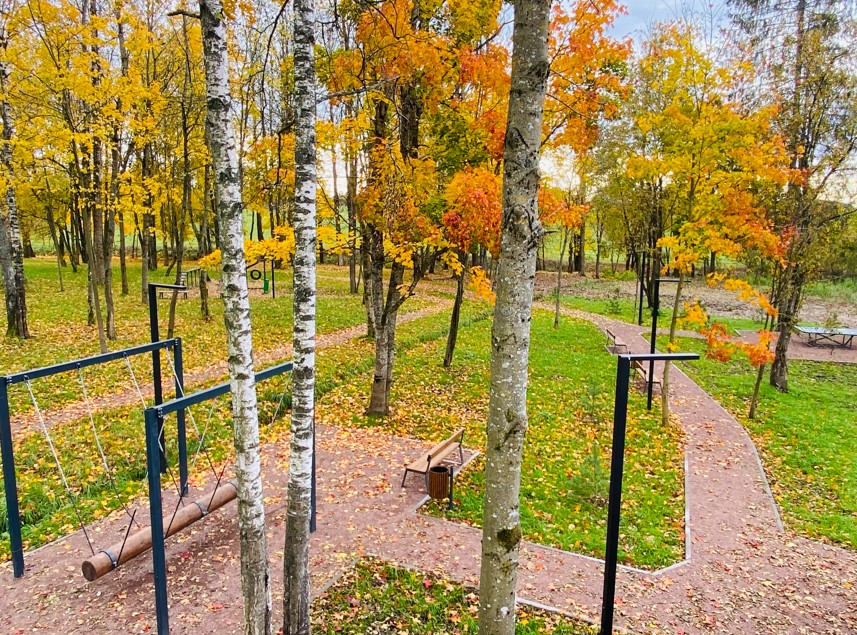 На благоустроенной территории были выполнены работы по устройству дорожек и игровых зон из набивного покрытия, что обеспечило комфортное передвижение и активные игры. Проведено озеленение, включая устройство газона и посадку различных зеленых насаждений, что сделало пространство более живописным и приятным для пребывания. Установлено наружное освещение, обеспечивающее освещенность в темное время суток, а также скамейки и урны для удобства отдыхающих. Для активного отдыха была сооружена горка для катания с ватрушками, совмещенная с беседкой, а также качель-бревно и площадка для игры в теннис. Кроме того, оформлена зона для фотографирования «Волшебный сад», добавляющая элемент волшебства, и организована велопарковка для удобства велосипедистов.