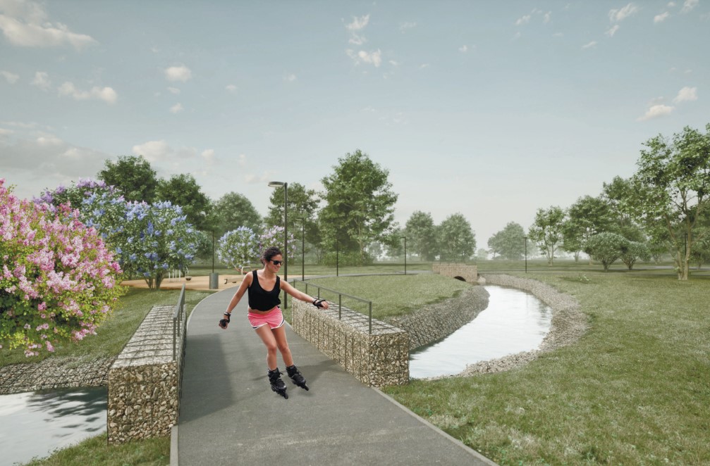 На территории организуют транзиты между Сбербанком, МФЦ, школой, жилыми домами и набережной. Будет зона отдыха с клумбой и подсветкой, а также кольцевая дорожка для роликов с площадкой для надевания и игровой зоной.