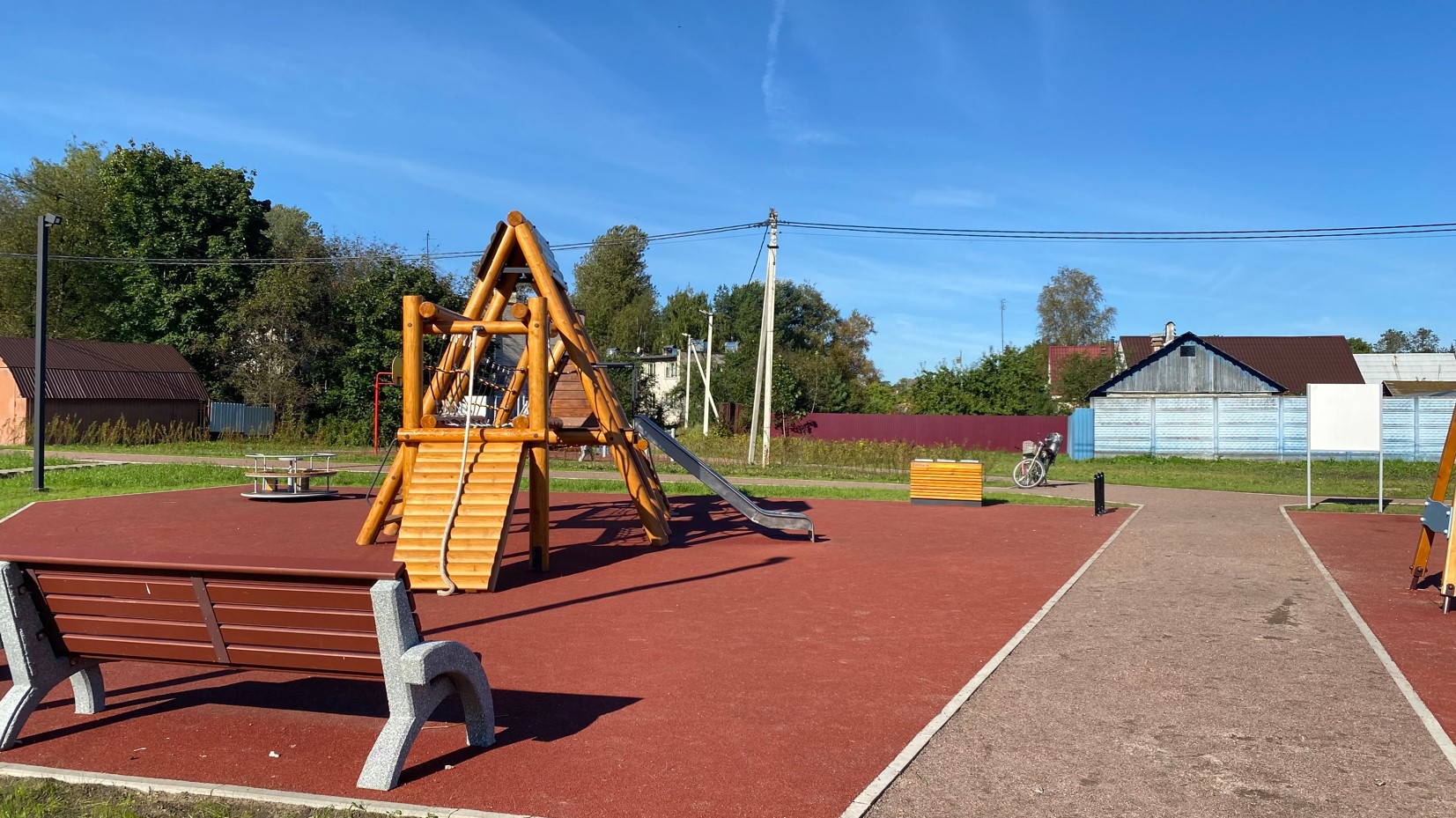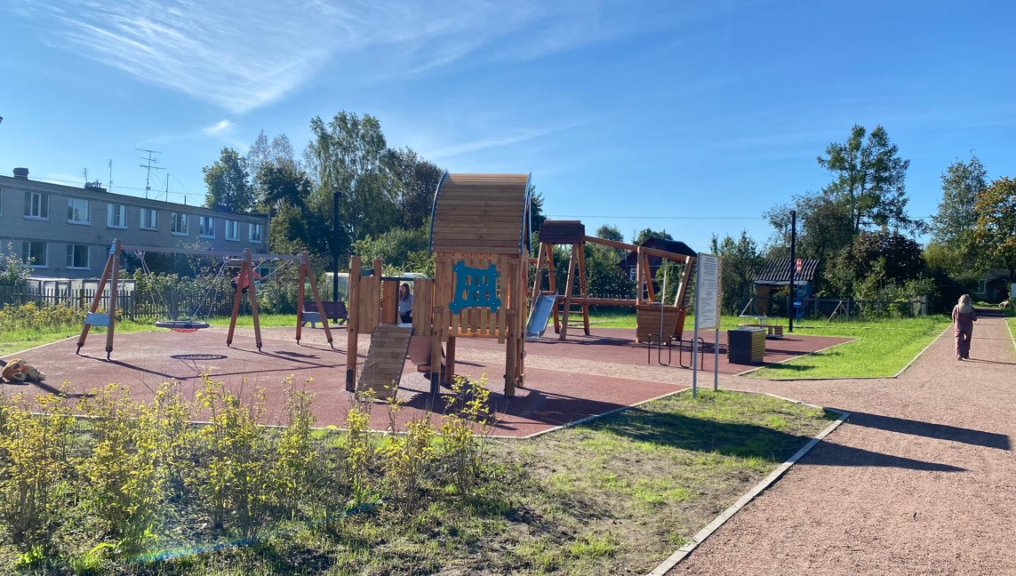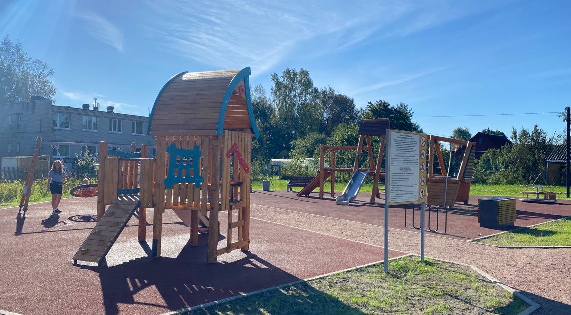 - детская игровая площадка с травмобезопасным резиновым покрытием. На площадке установлены игровой комплекс «Домик с горкой» и «Веревочный комплекс», качели, карусель