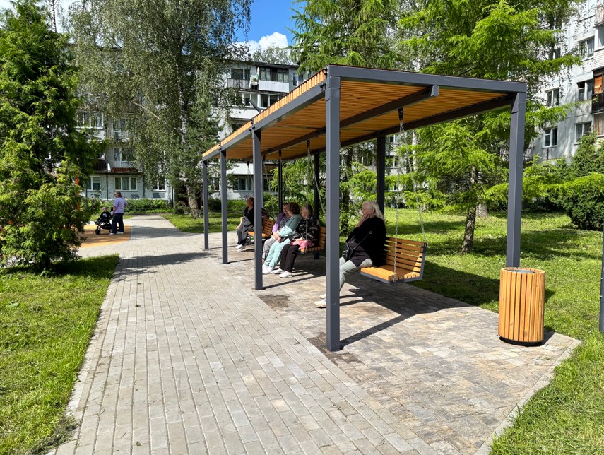 Для отдыха взрослых предусмотрены две площадки – с навесом и скамейками и качелями-навесом. Сценарии использования по сезонам. Игровые площадки подходят для игры как в летний, так и зимний период. Также навесы с водонепроницаемым покрытием позволяют укрыться от дождя и солнца, что повышает комфорт использования территории. Энергоэффективность. Видеонаблюдение. На территории предусмотрено энергоэффективное освещение двух типов - однорожковые опоры и двурожковая опора высотой 5 м. Был выполнен расчет освещенности территории - освещенность соответствует нормативам. Также предусмотрена система видеонаблюдения с 3 камерами.