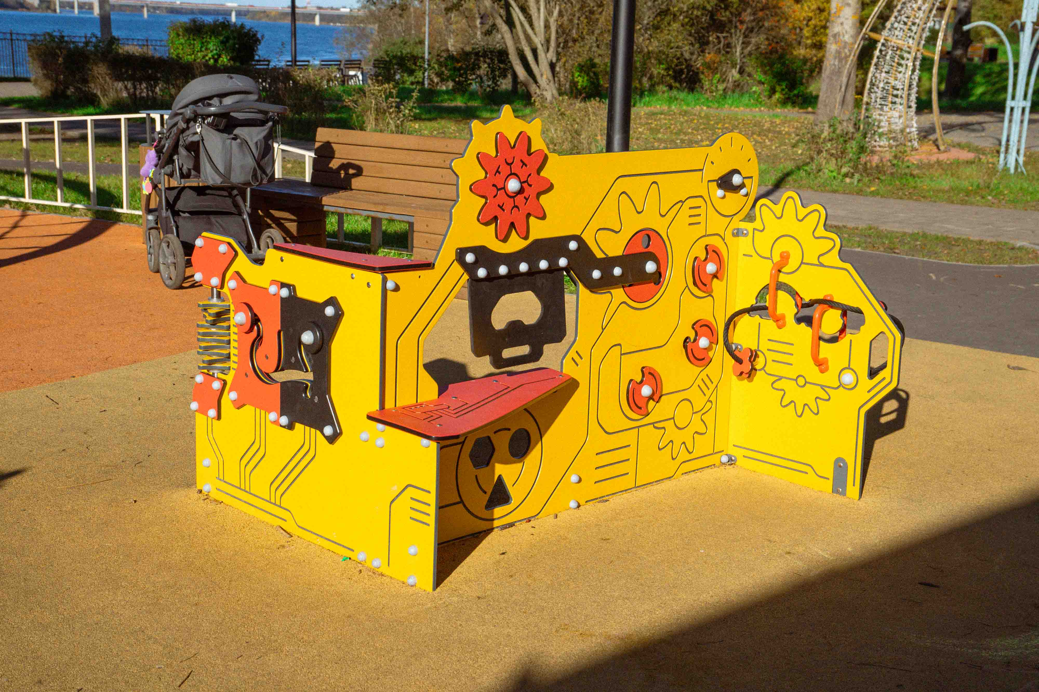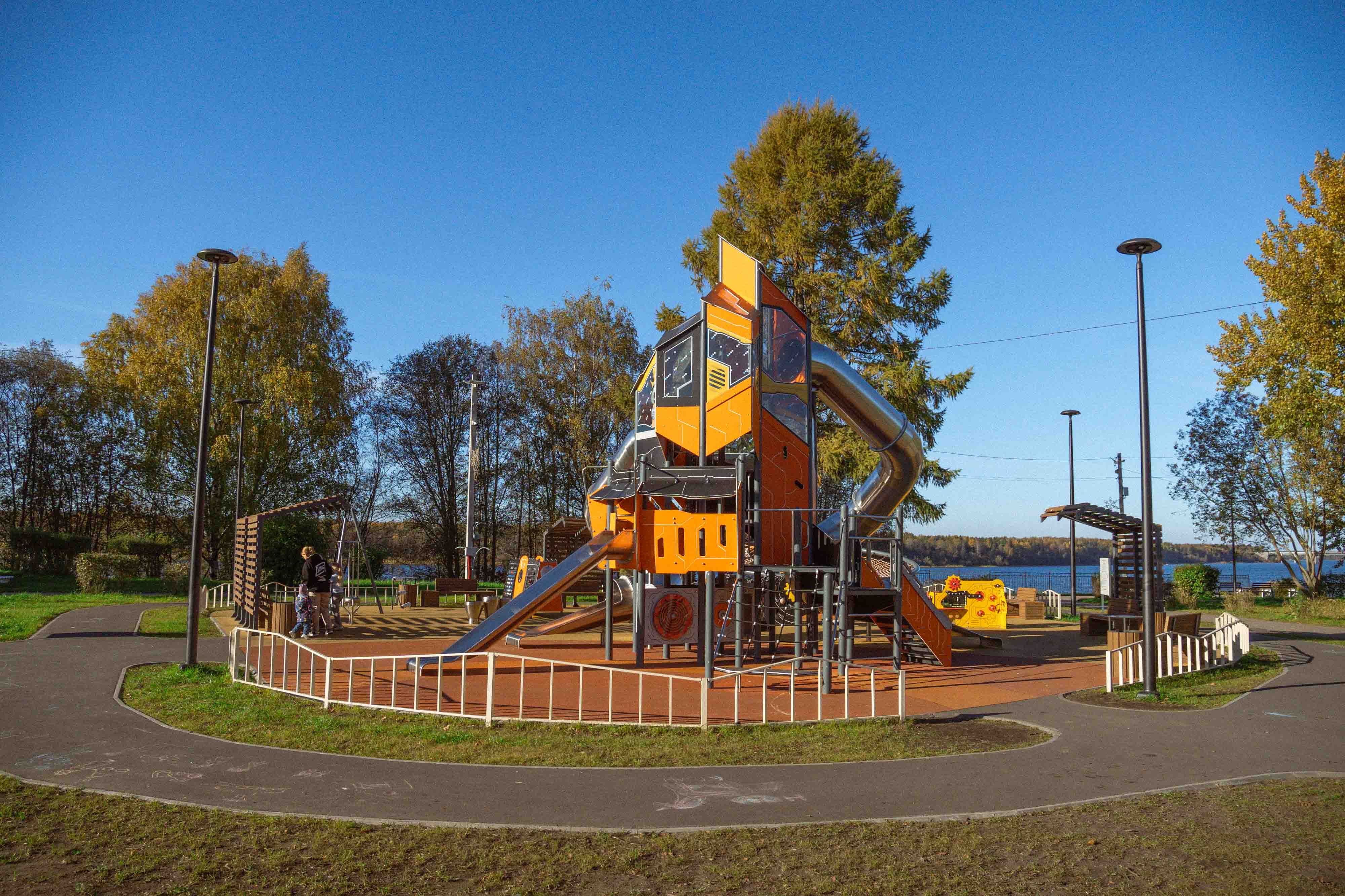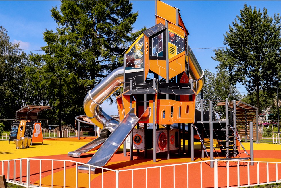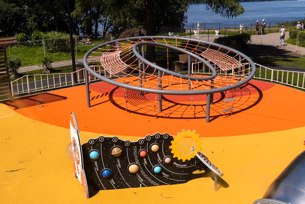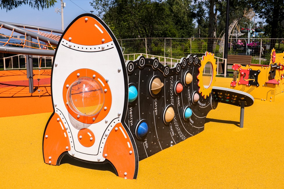 Основной задачей стало создание качественно новой детской площадки на научную тематику. Взаимодействуя с игровыми элементами, дети смогут познакомиться с космосом, механикой и даже музыкой. Комплекс включает в себя уличное музыкальное оборудование : металлофон, барабаны и глюкофон. Помимо развития мелкой моторики, детям предложат большой комплекс с горками разных типов и оборудование для скалолазания.Закольцованная велодорожка позволит малышам совершать безопасные поездки на роликах, самокатах и беговелах в поле зрения родителей.