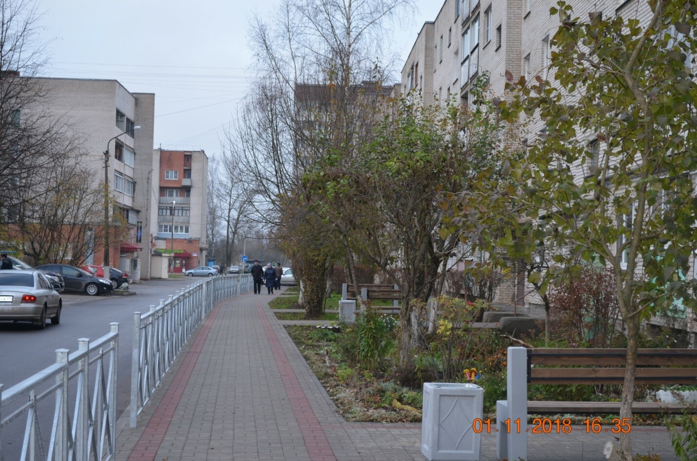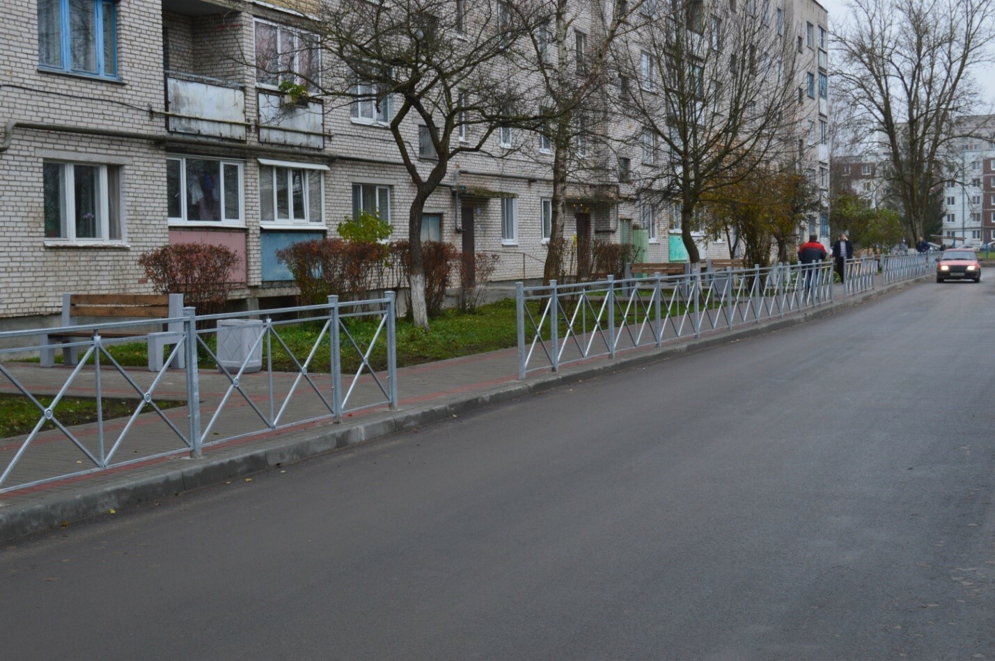 -обустроен тротуар с ограждением,
