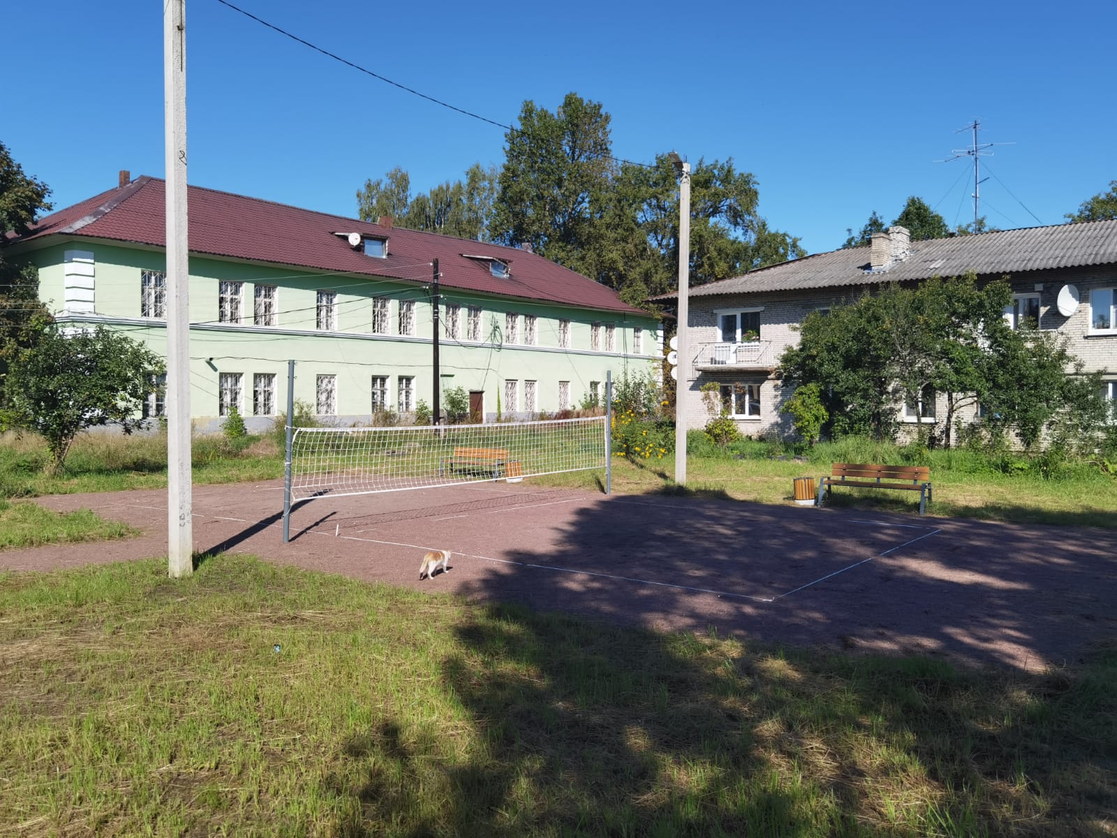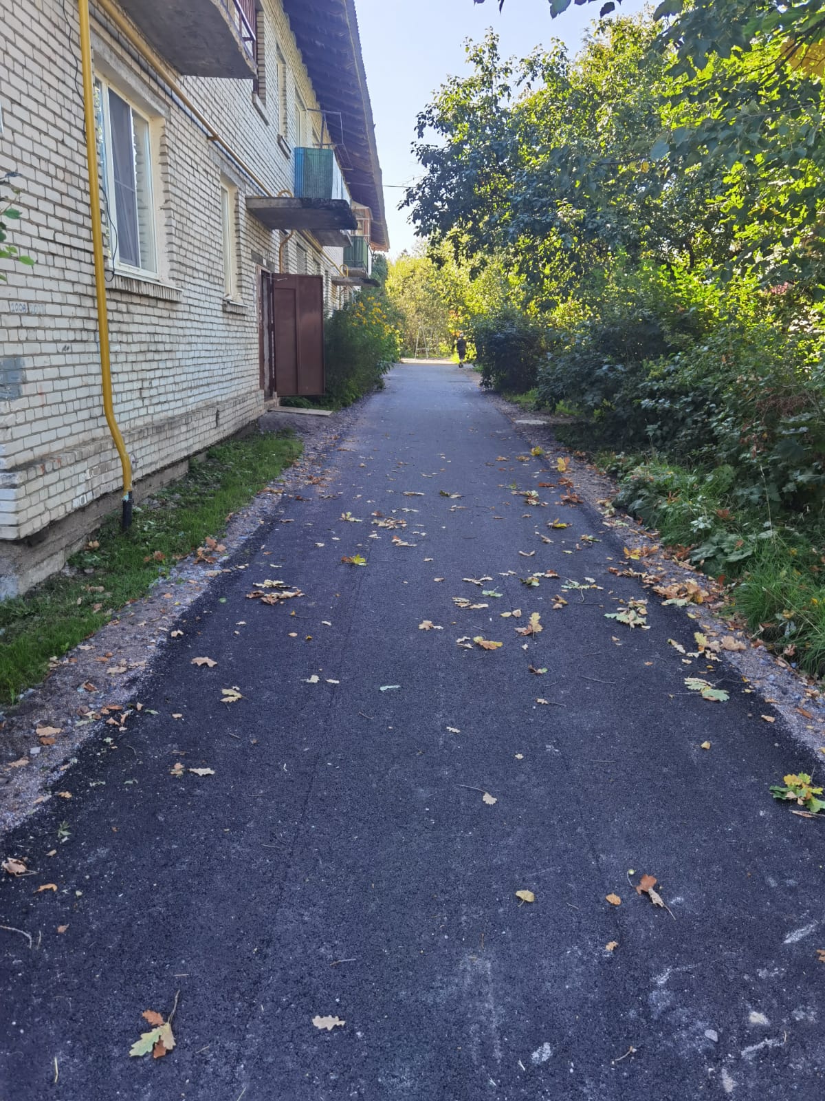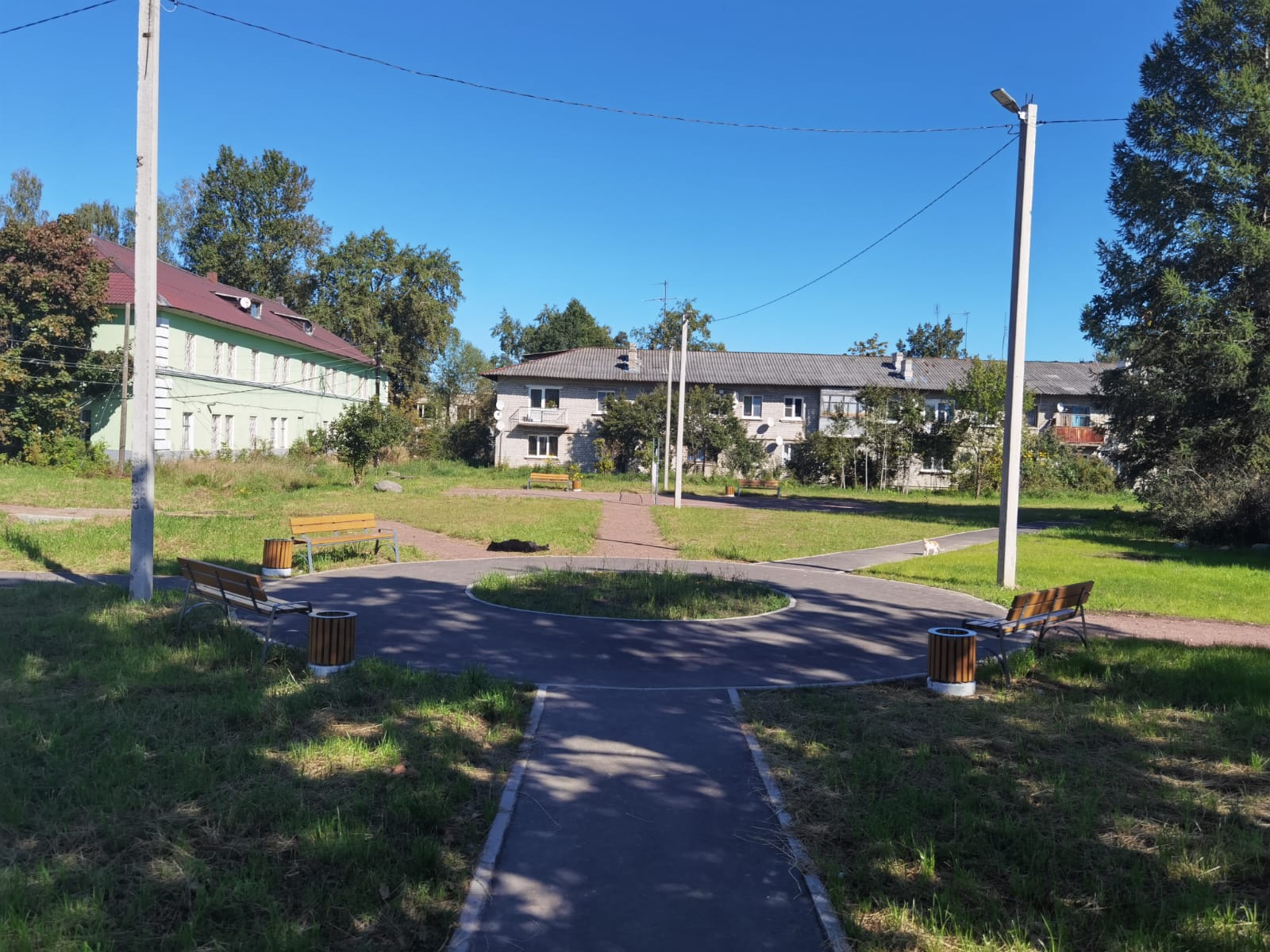 Благоустройство дворовой территории: тихий двор с широким обзором, большим участком с деревьями. Произведена замена а/б покрытия проезда, установлены урны, скамейки, установлены опоры уличного освещения со светодиодными светильниками, установлены 2 игровых комплекса, а также волейбольная площадка.