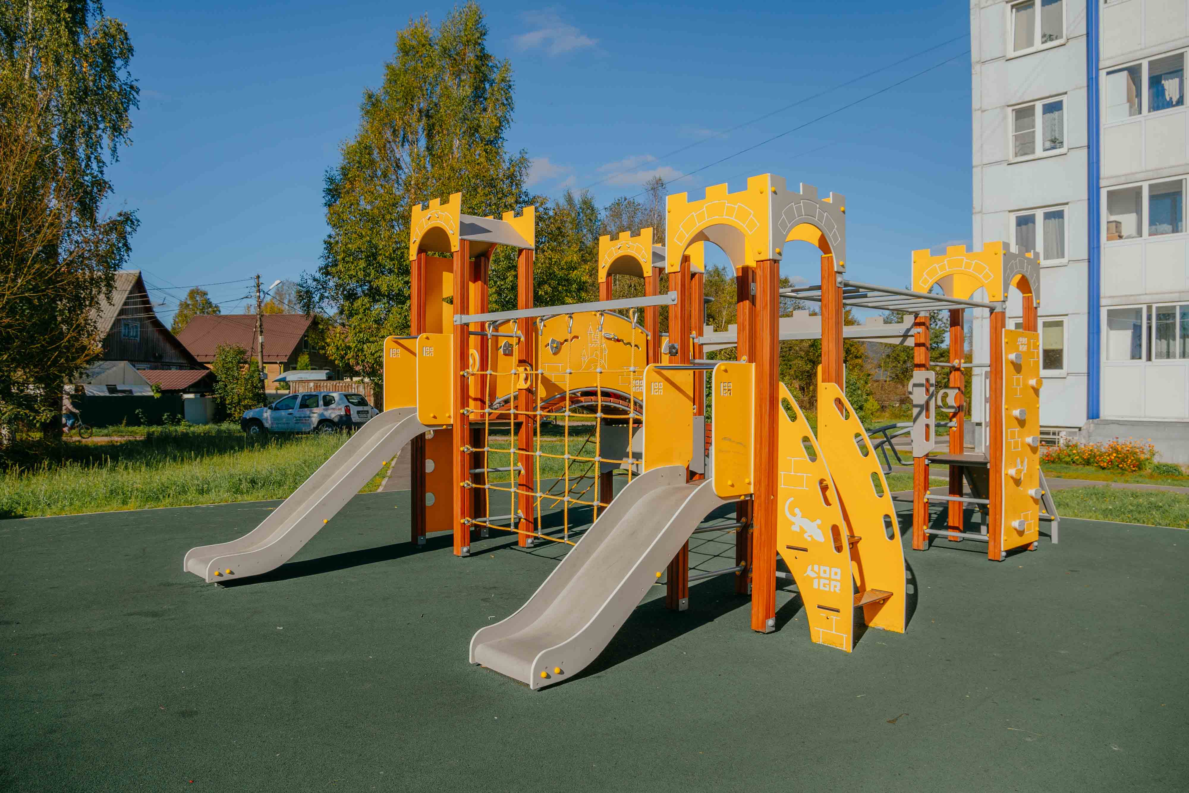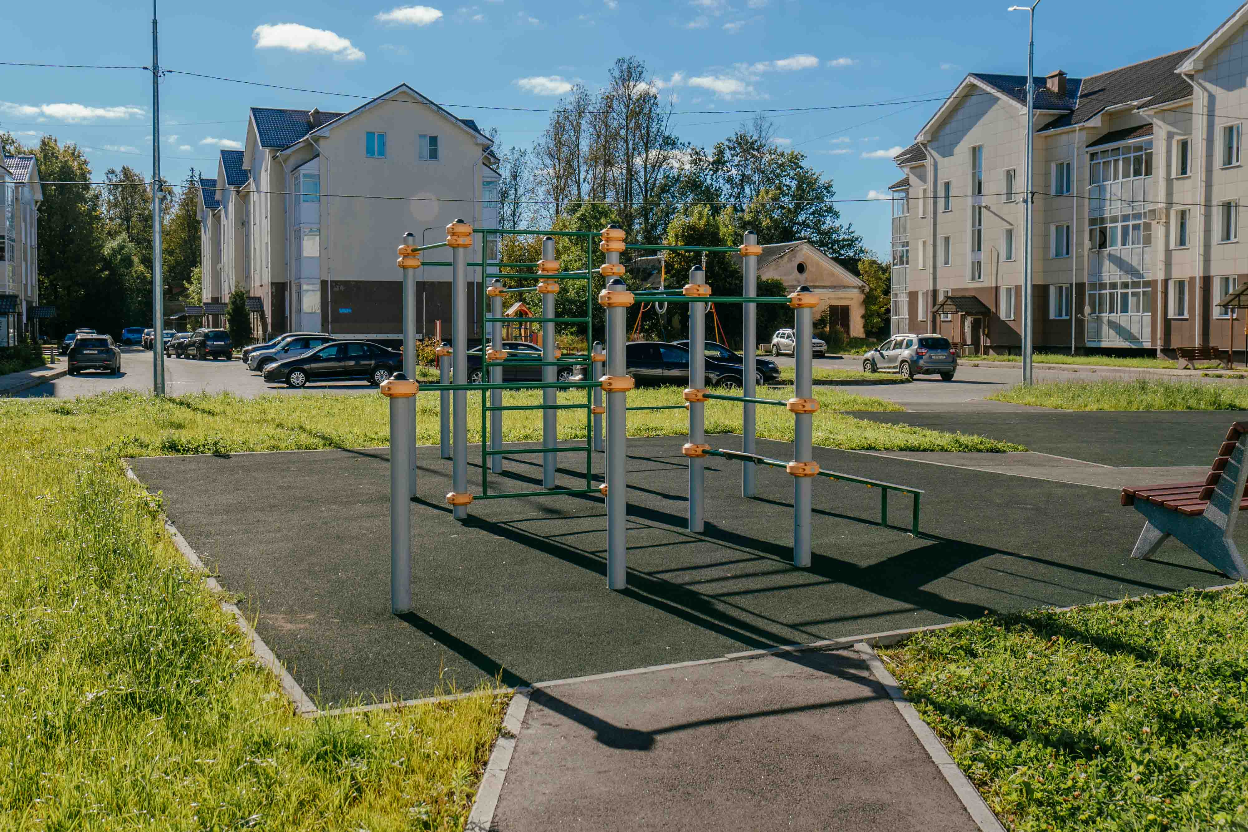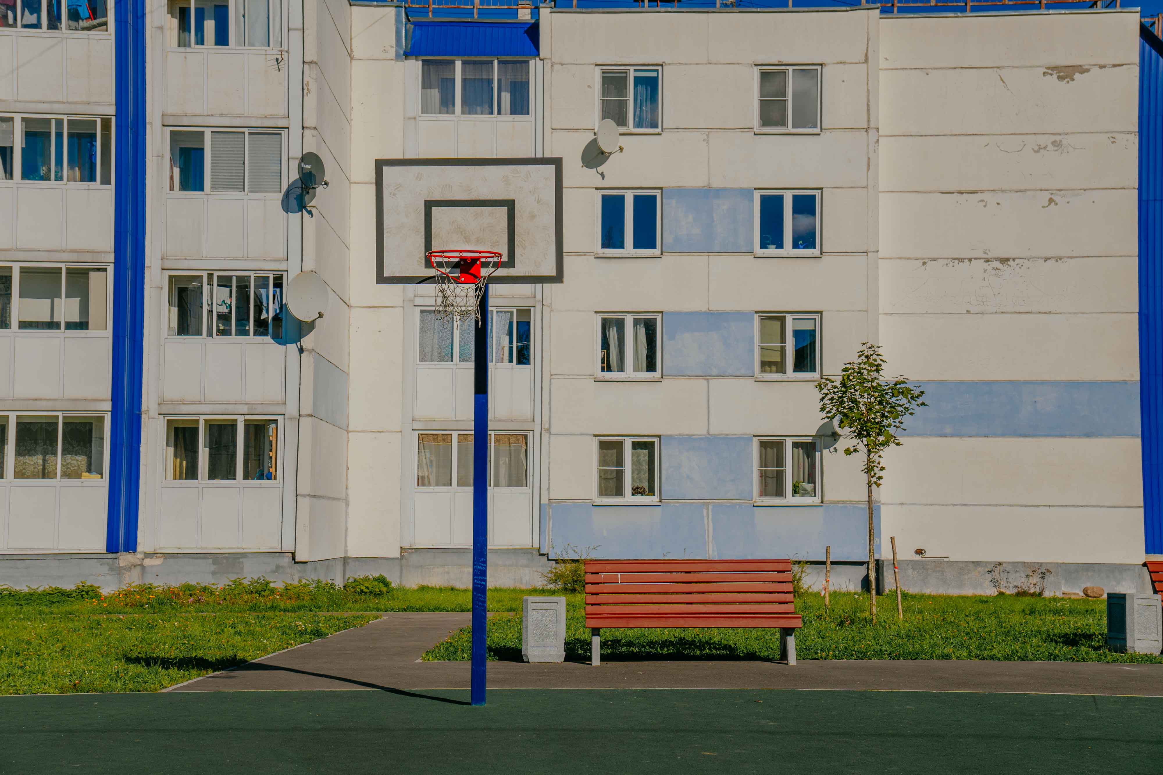 Территорию благоустроили, установив современную детскую площадку с безопасными игровыми элементами, а также разместив лавочки и скамейки для отдыха родителей и посетителей. Для активного отдыха появилась баскетбольная корзина, что сделало зону более привлекательной и удобной для всей семьи.