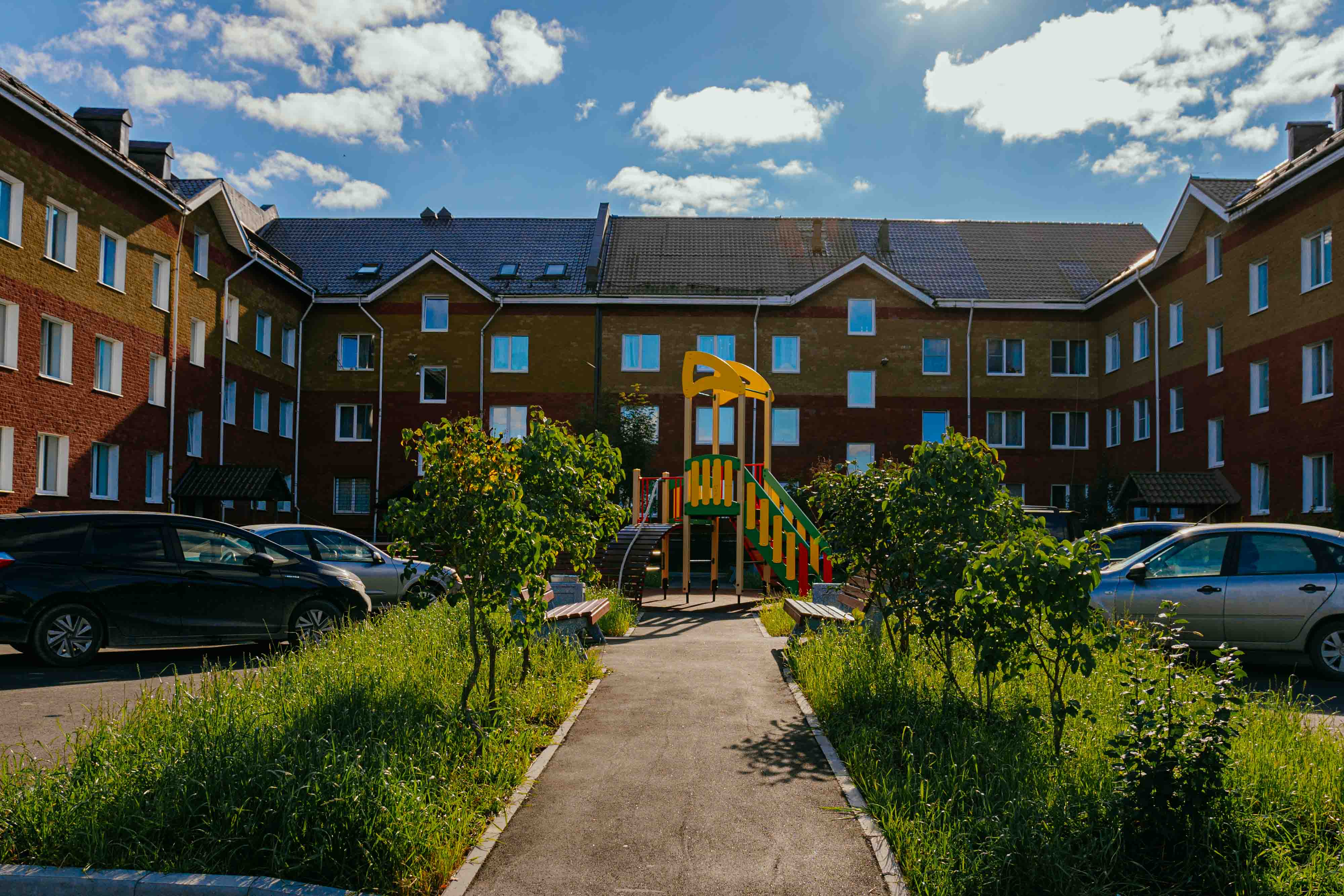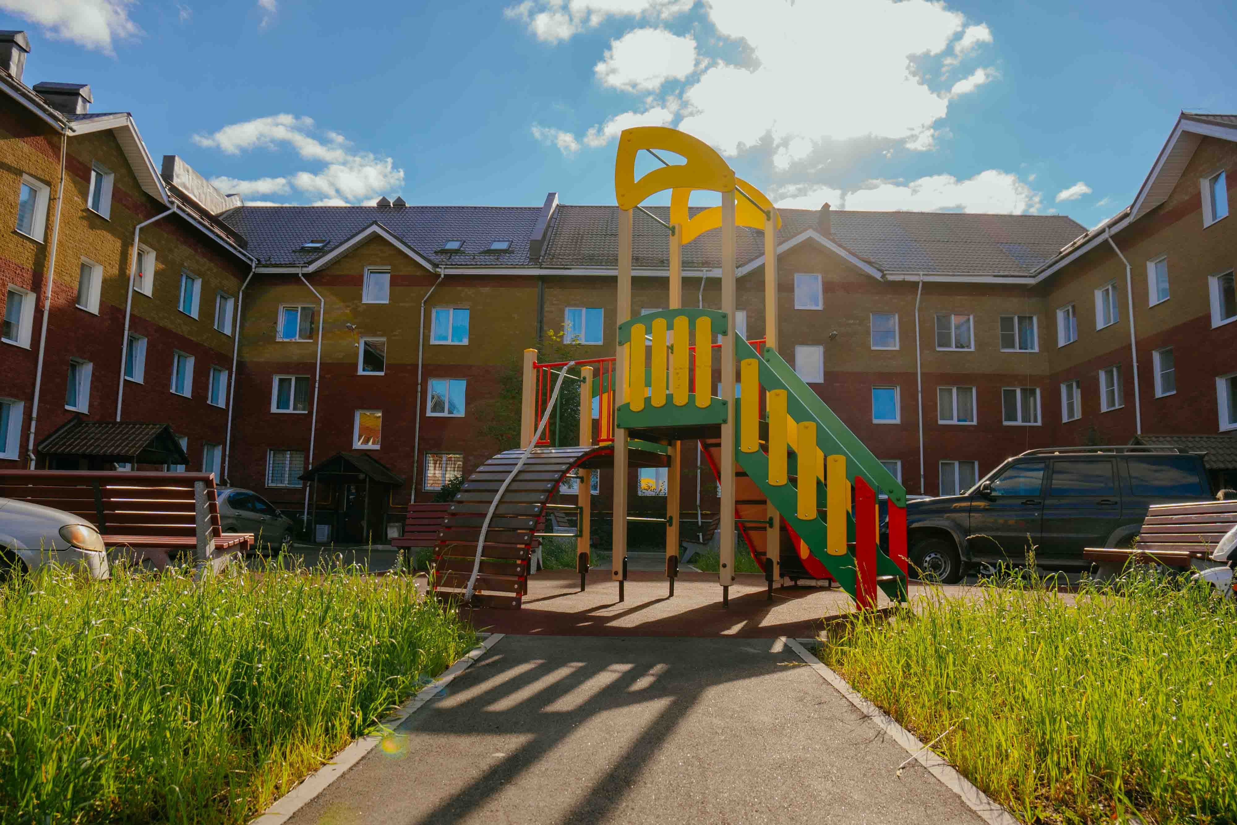 Территорию благоустроили, установив новую современную детскую площадку и разместив лавочки и урны для комфорта посетителей. Также было заменено асфальтовое покрытие, что сделало территорию безопаснее и приятнее для прогулок и отдыха.