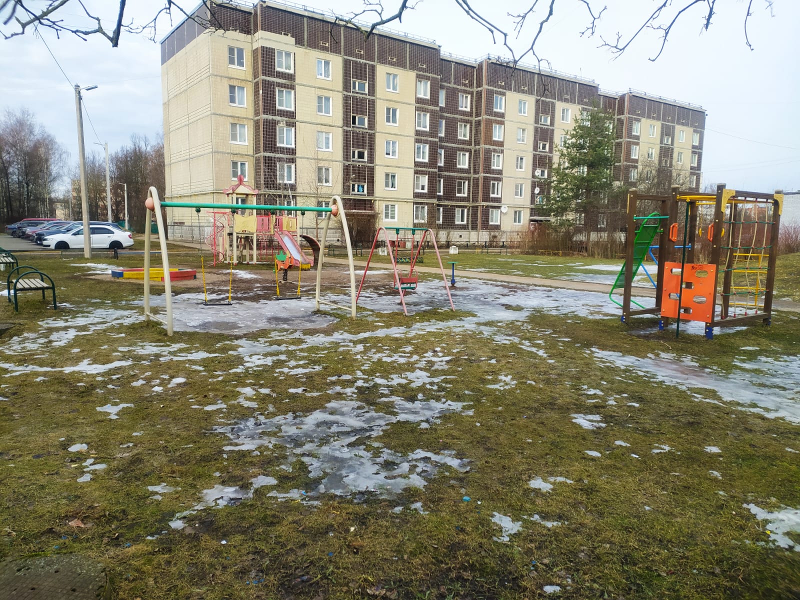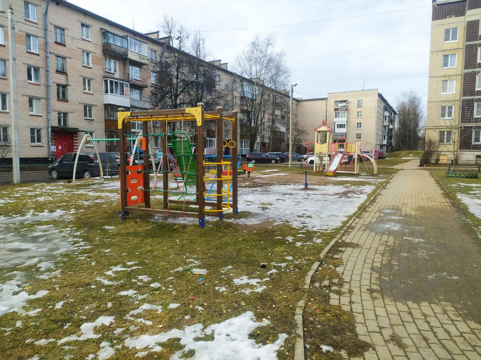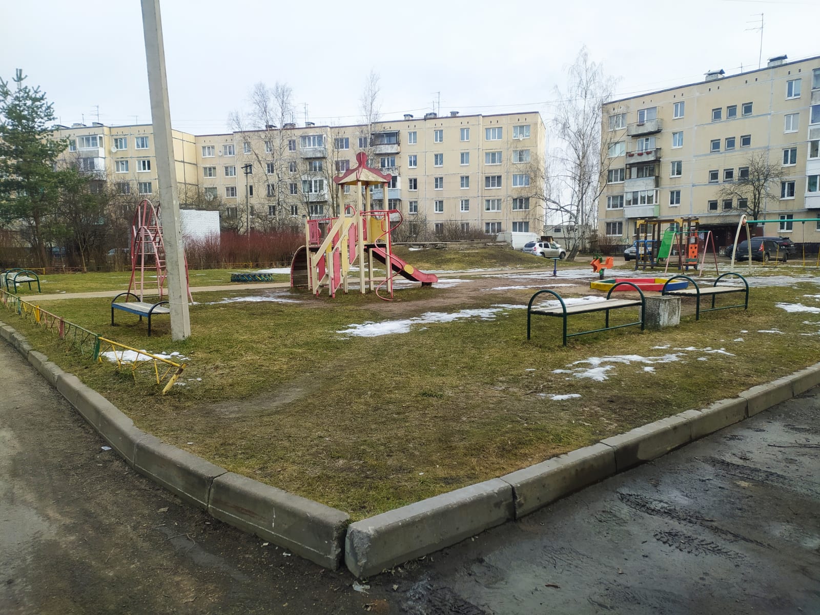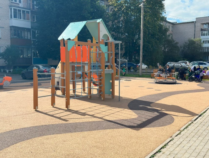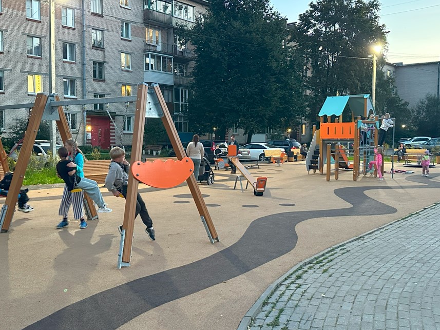 Территорию благоустроили, установив яркую детскую горку и песочницу для малышей. Также благодаря расположению лавочек и урн территория стала более удобной и комфортной для отдыха и прогулок.