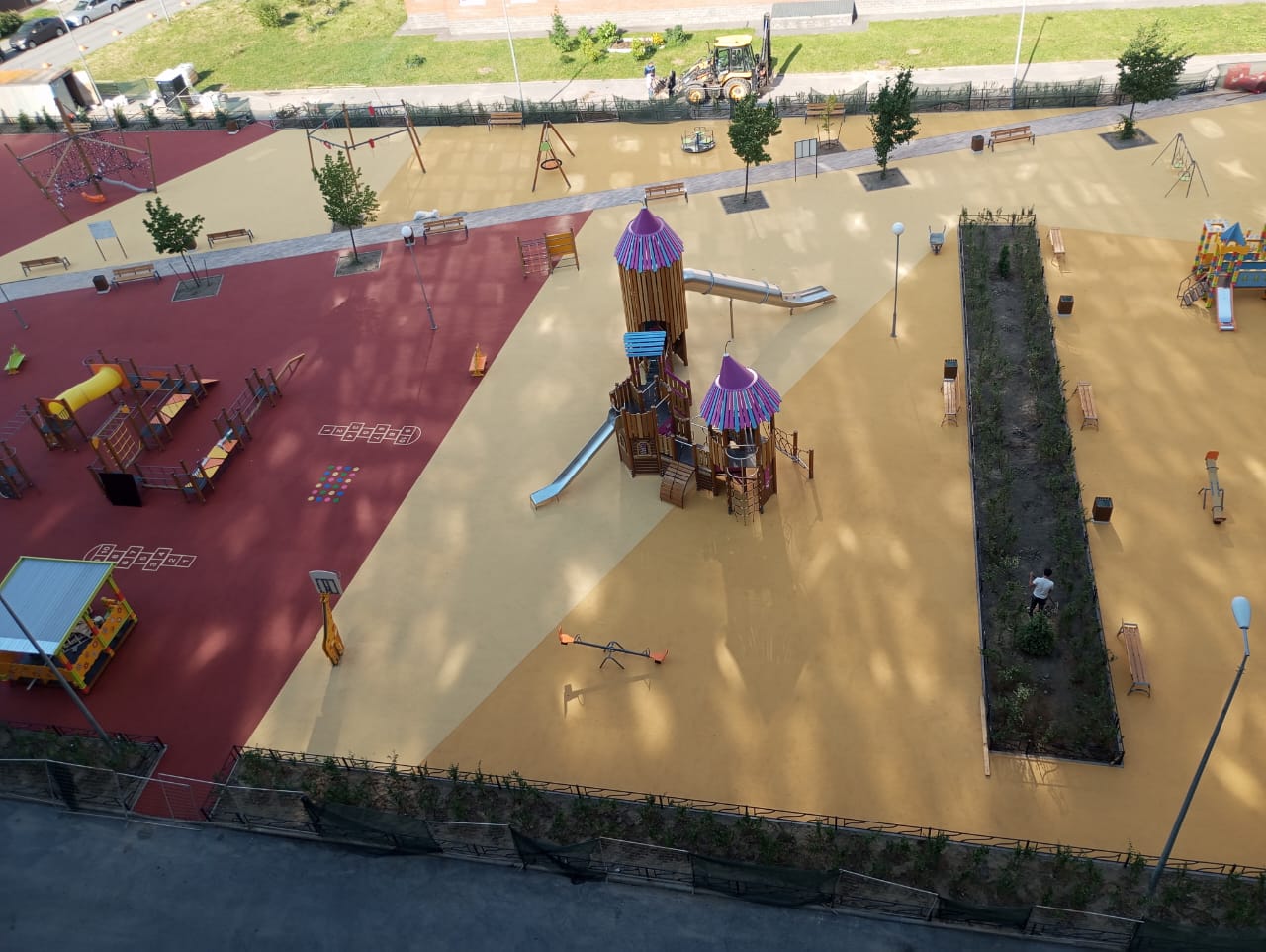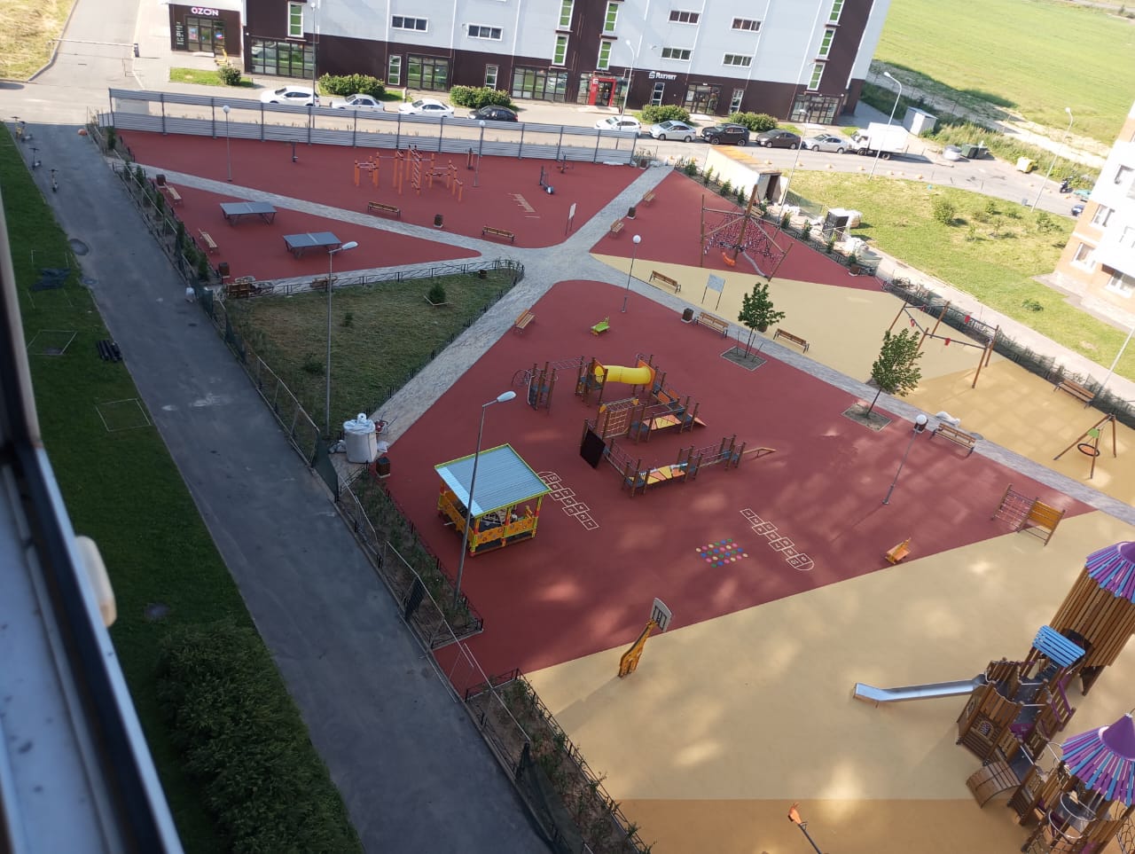 Территорию благоустроили, установив новую детскую площадку и современные спортивные тренажёры для активного отдыха. Для безопасности посетителей постелили мягкое, безопасное покрытие под игровыми и спортивными зонами. Также высадили зеленые кустарники, созданные уютные и приятные для прогулок зеленые насаждения. Всё это сделало территорию более комфортной и привлекательной для семей и отдыхающих.