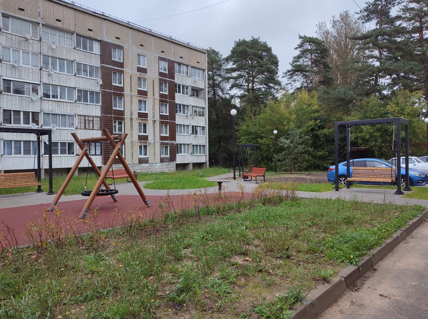 Территория была благоустроена с установкой новых дорожек из тротуарной плитки, удобных скамеек со спинками и урн, что улучшило условия для отдыха. Добавленные пандусы у подъездов обеспечили доступность для маломобильных граждан, а посадка многолетних цветов и туй в существующие клумбы добавила яркости и ухоженности. Также был проведен точечный водоотвод на парковке, установлены малые архитектурные формы (МАФы) и детские игровые элементы, а новое освещение обеспечило безопасность и комфорт в вечернее время.
