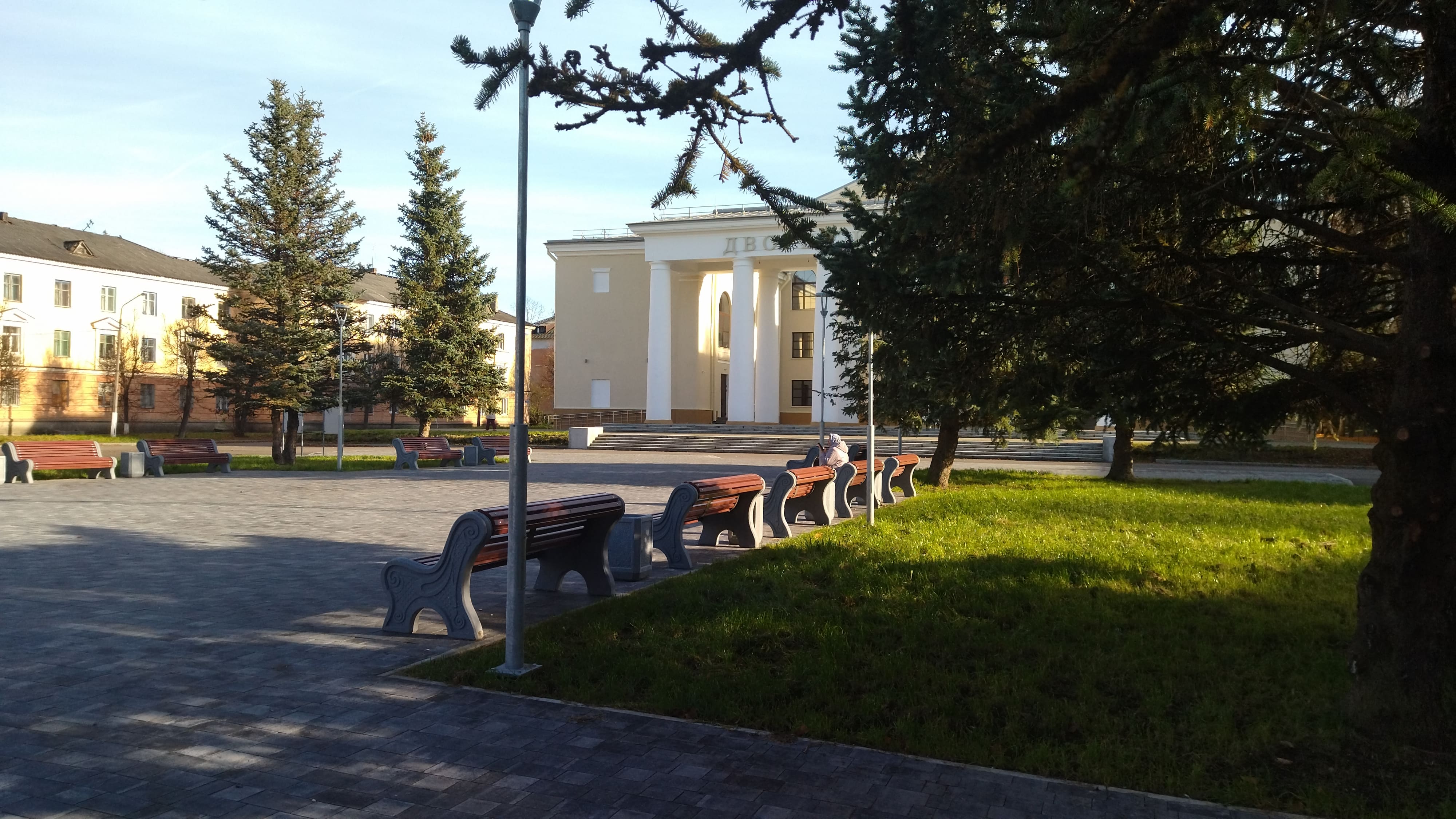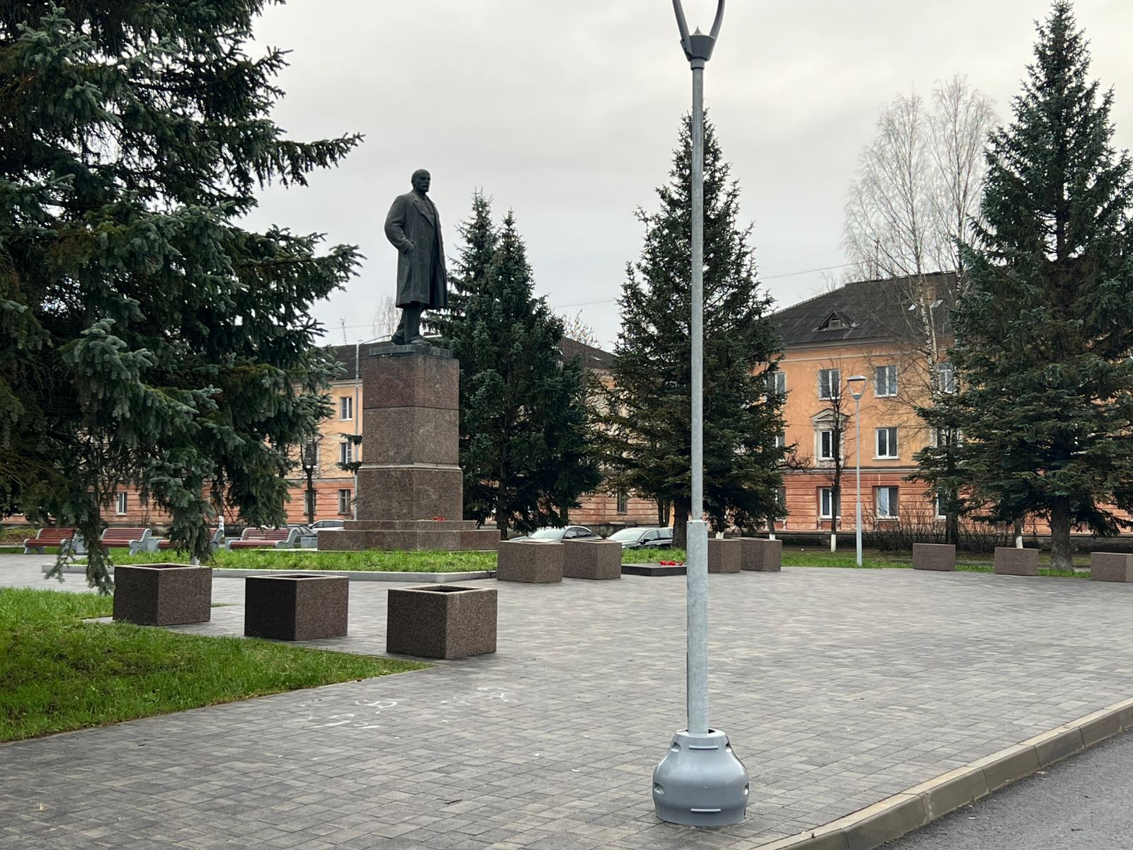 Основную пешеходную зону расширили за счет центральных газонов. Появились удобные скамейки со спинками и урны для поддержания чистоты. Вечером и ночью территорию освещают фонари, чтобы создать комфортную атмосферу. Для автомобилистов обустроили две парковки по бокам площади. Всего 44 места, включая места для инвалидов.