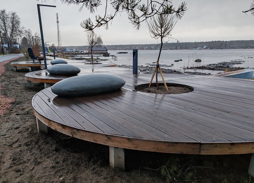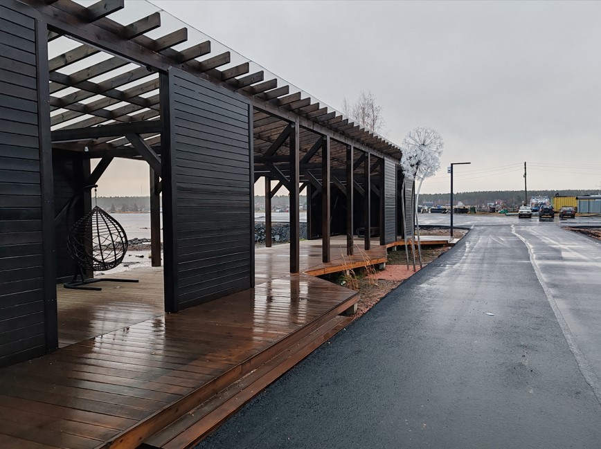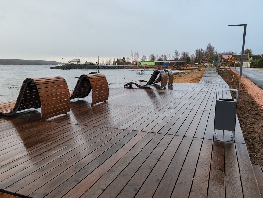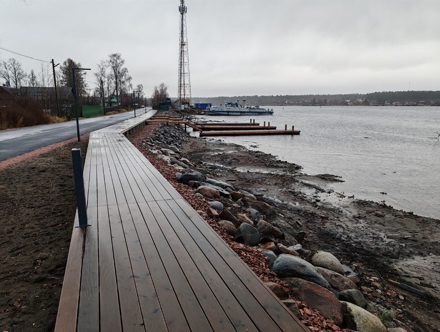 На территории организуется прогулочная зона с деревянным настилом, соединяющая площадки с различными функциями. Включает зону ожидания парома с павильоном, зону отдыха, асфальтирование проезда, детскую зону и зону причалов для лодок. На территории предусмотрено энергоэффективное освещение двух типов - высокие опоры 4 м и декоративные светодиодные торшеры. На всей территории набережной высажены шаровидные ивы.