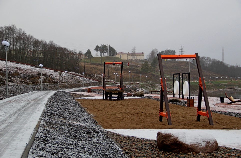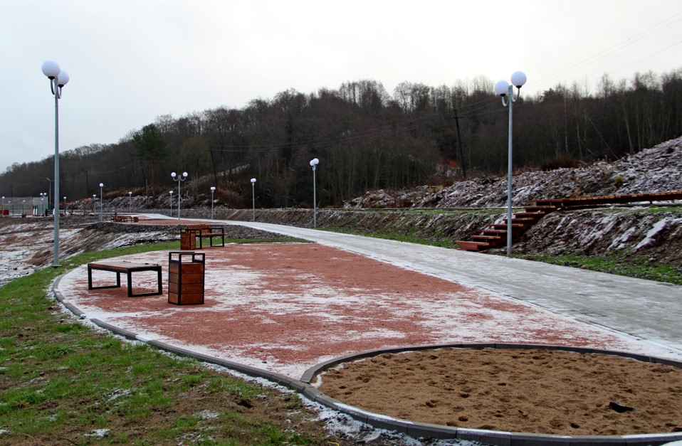 Комплексное благоустройство общественной территории предусматривает создание пешеходной зоны с местами для отдыха и МАФ, игровые комплексы. Весь прогулочный путь, площадки со скамьями и освещен уличными светильниками. Покрытия пешеходных дорожек предусмотрены из тротуарной плитки серого, красного и черного цвета, что соответствует общей стилистики территории.