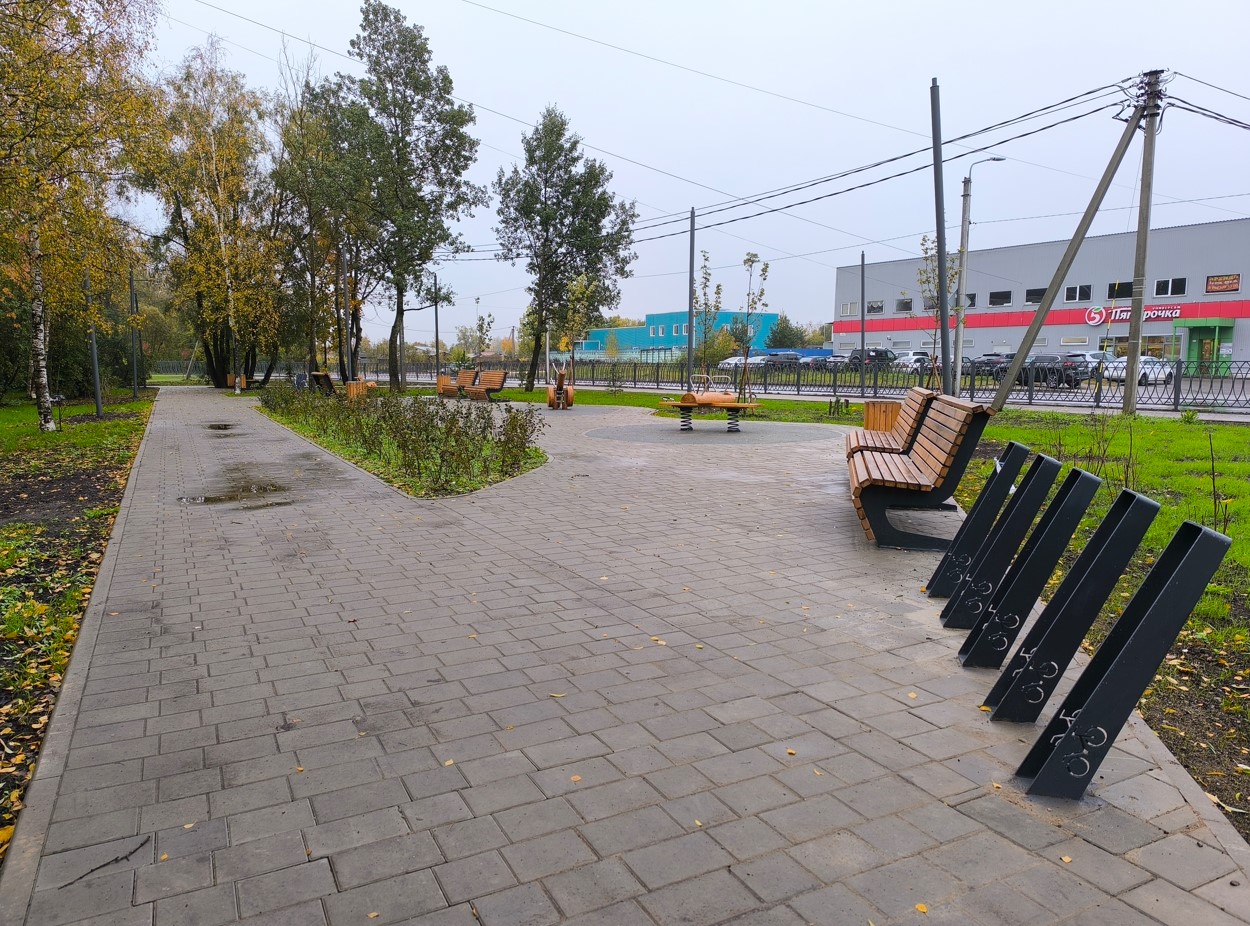 На благоустроенной территории выполнено покрытие пешеходных дорожек и организованы насыпные тропинки, что обеспечивает удобный доступ для прогулок. Установлены современные урны и скамейки, создающие комфортные места для отдыха и поддержания чистоты. Кроме того, были поставлены качели, которые добавляют элемент развлечения и привлекают детей и взрослых к активному отдыху на свежем воздухе