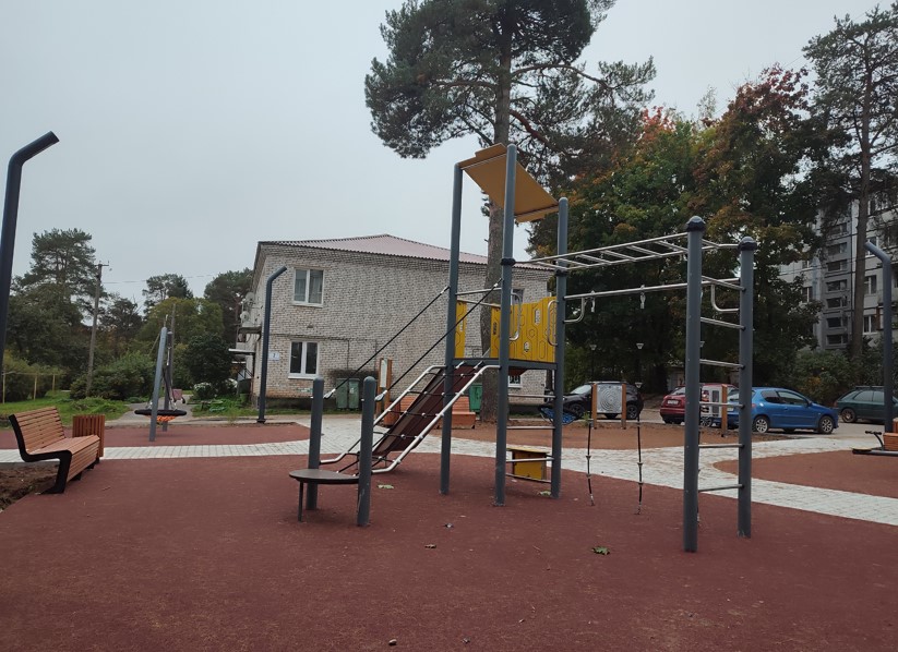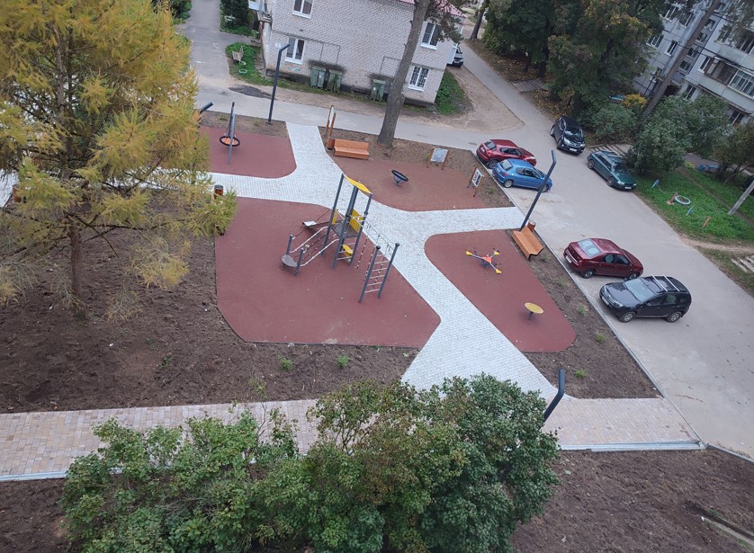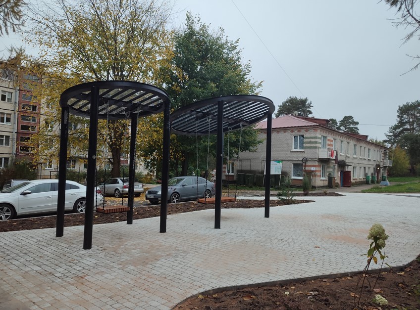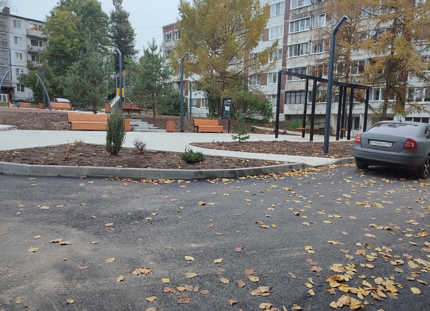 На благоустроенной территории было уложено твердое покрытие из тротуарной плитки, что обеспечило комфортное передвижение. Установлено энергоэффективное светодиодное освещение для повышения безопасности в любое время суток, а также создана современная детская площадка с резиновым покрытием и зонами отдыха с городскими качелями. Дополнительно организованы зоны тихого отдыха, расширена парковка и внедрено разноуровневое озеленение с ландшафтными композициями для создания приятной атмосферы.