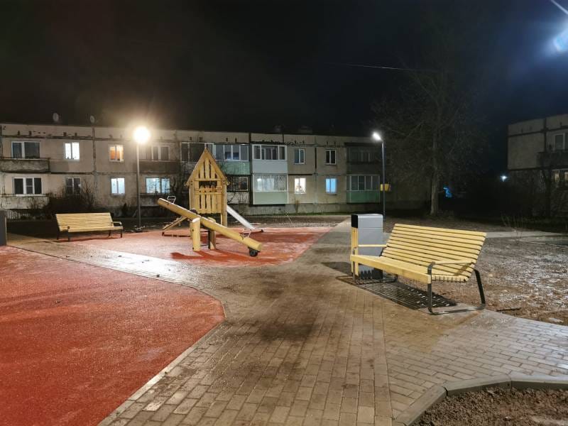 Пространство преобразилось: появилась современная детская площадка, установлены удобные лавочки и урны. Асфальтовое покрытие заменили, что повысило безопасность и комфорт для прогулок и отдыха.