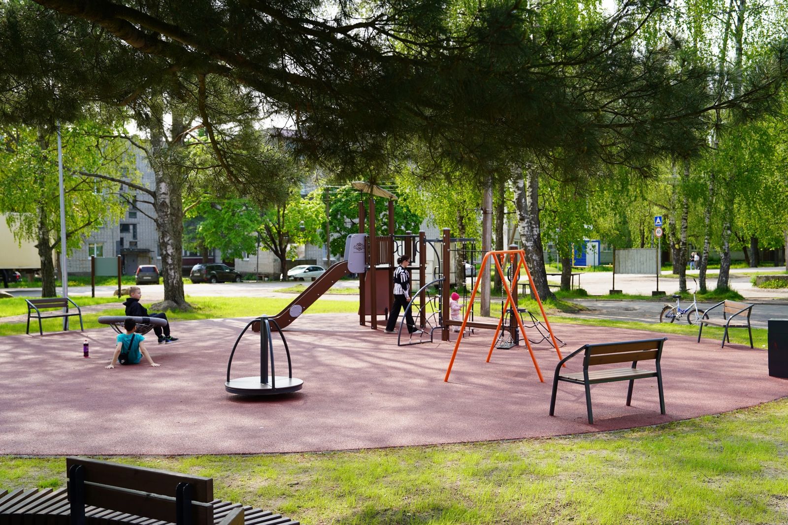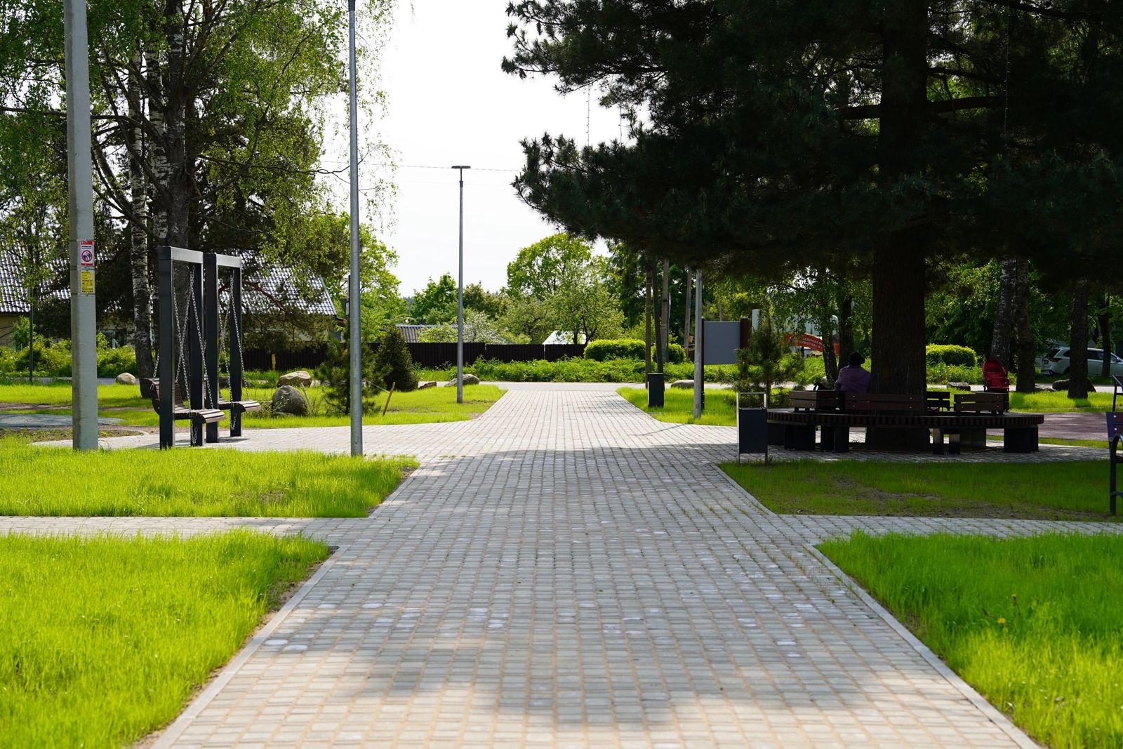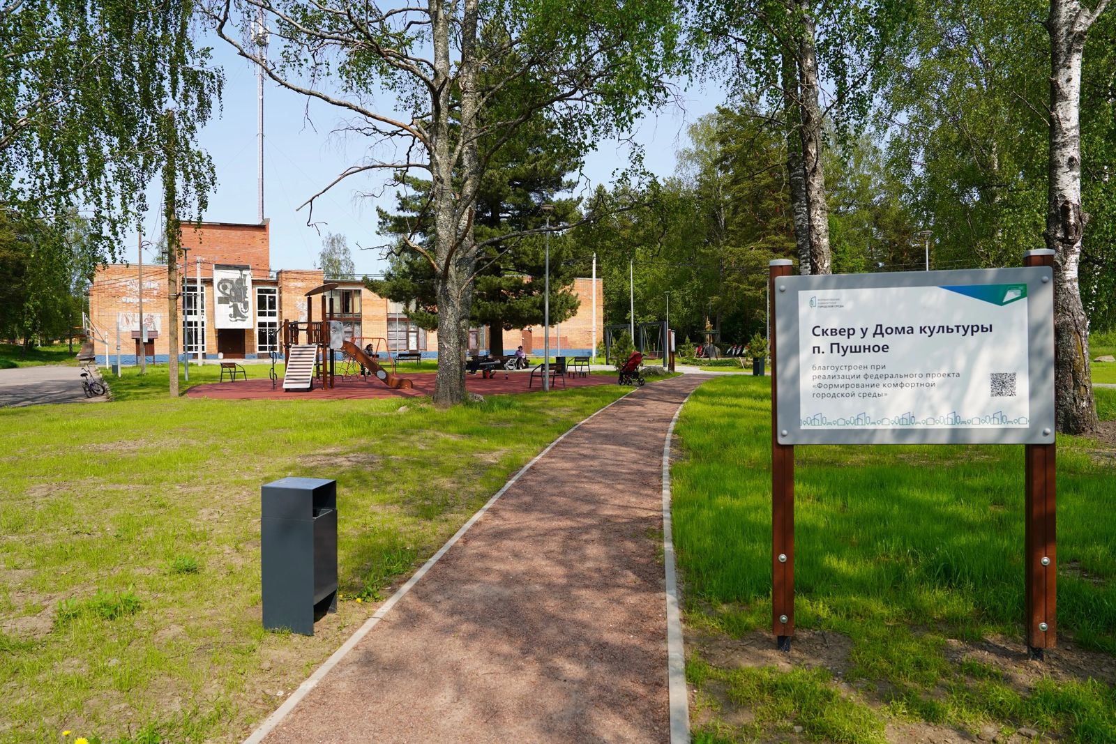 Выполнены работы по благоустройству территории: устройство набивных дорожек, ремонт пешеходных дорожек из плитки, установлено детское игровое оборудование, высажены деревья, установлены МАФы, установлены фонари уличного освещения.