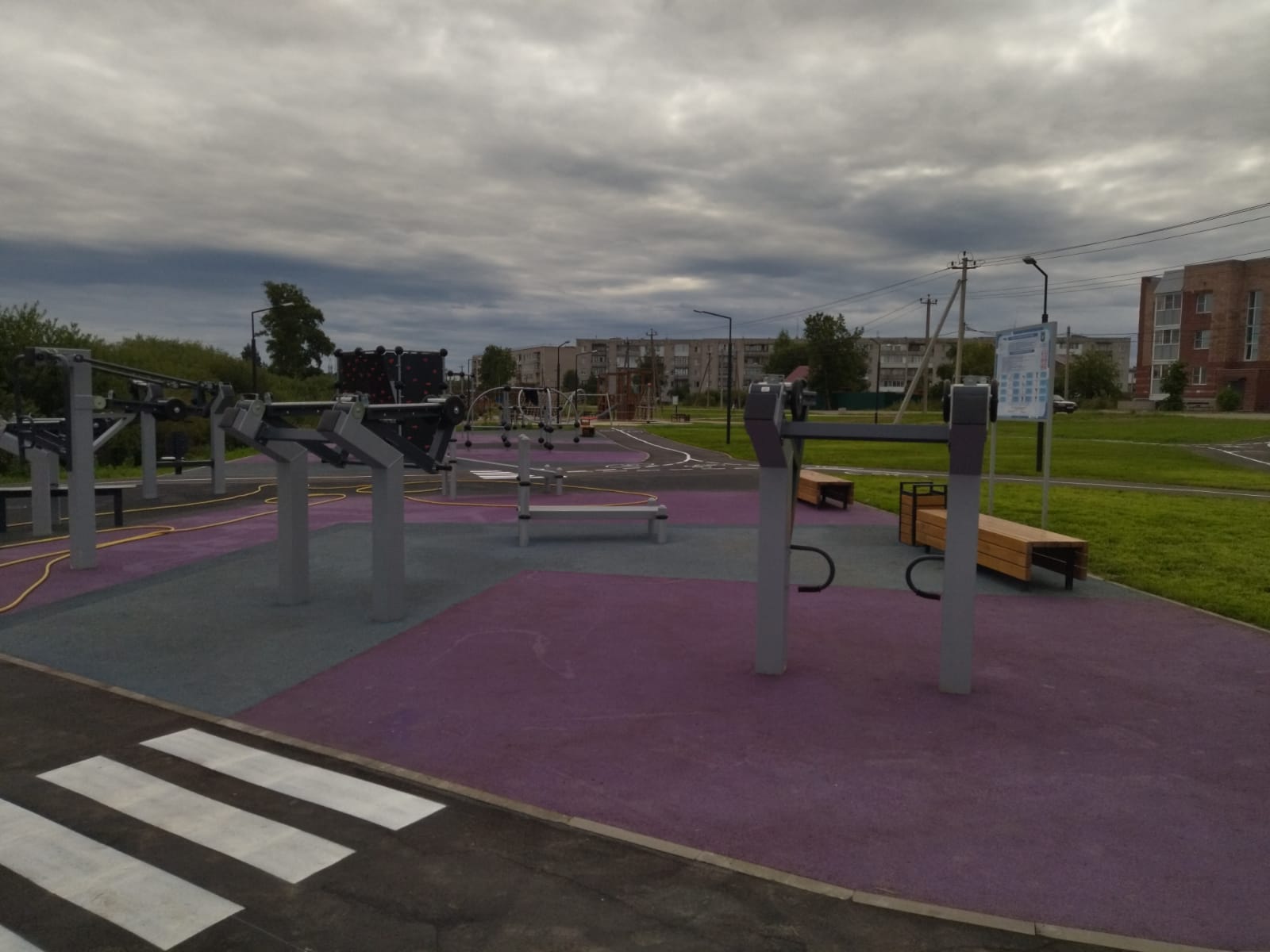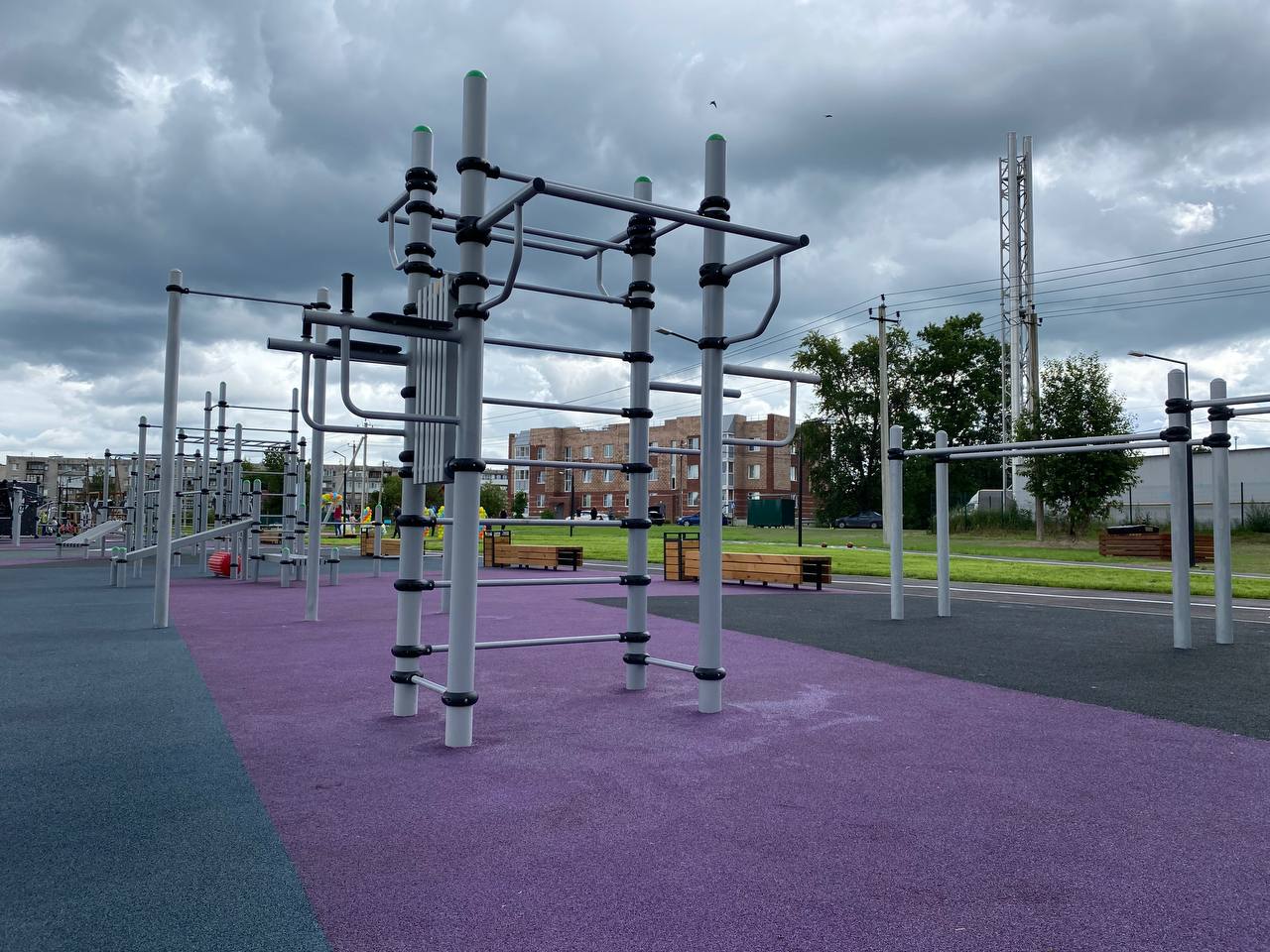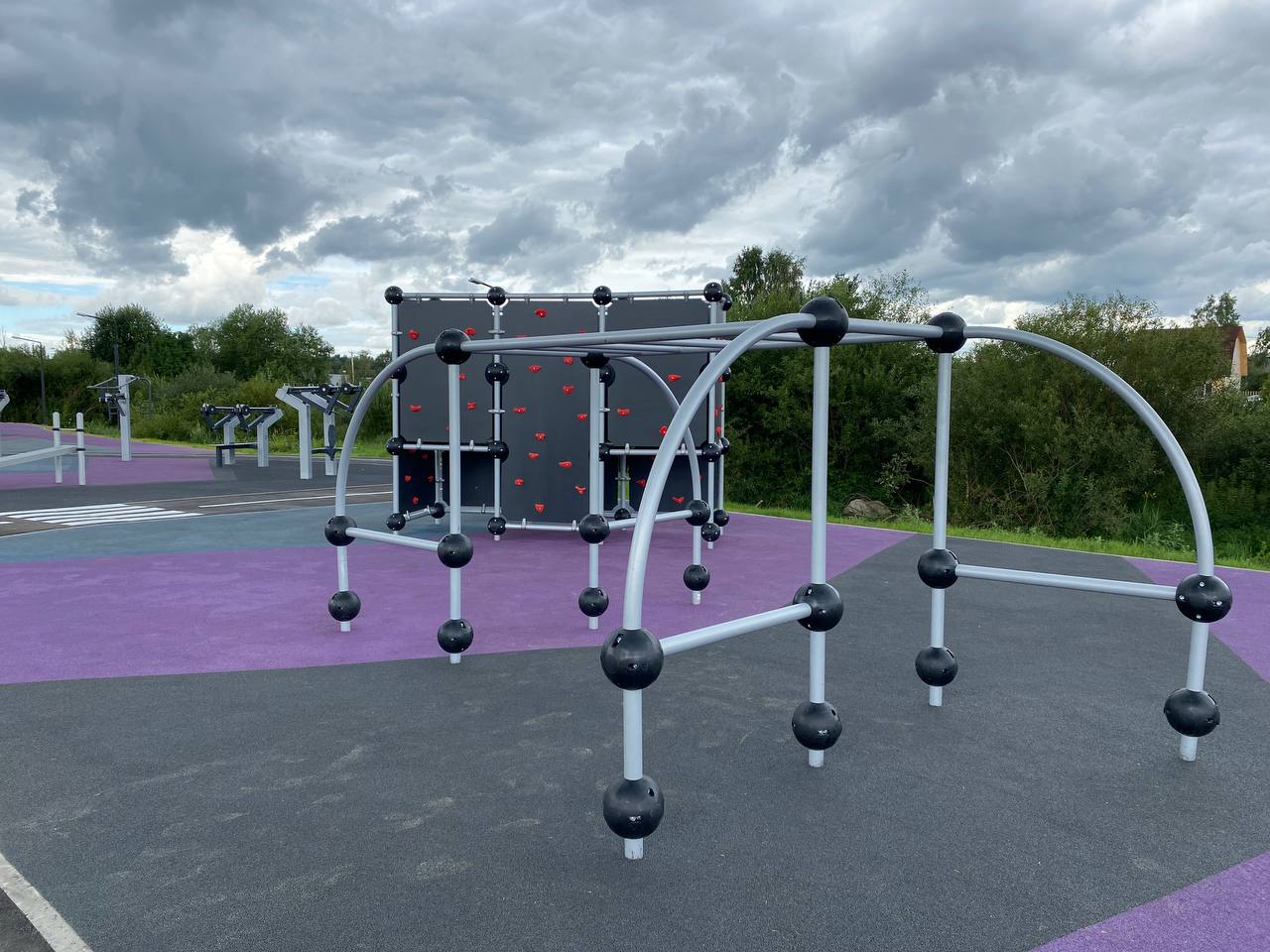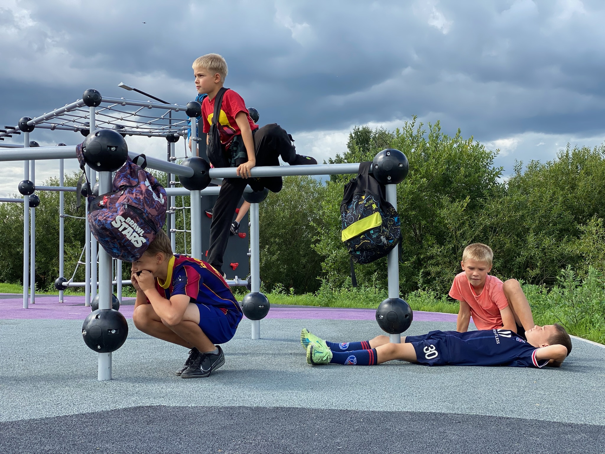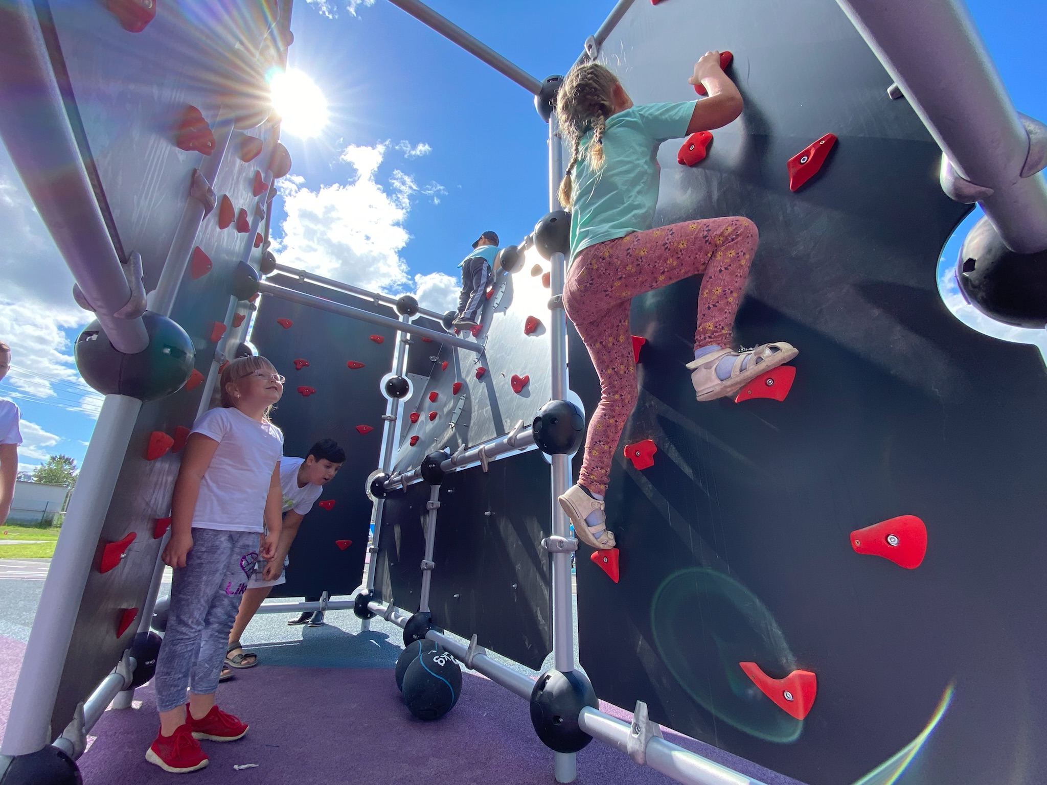 Современная детская площадка с резиновым фиолетовым покрытием, обеспечивающий безопасность. Есть участки, где дети могут попробовать себя в качестве скалолаза