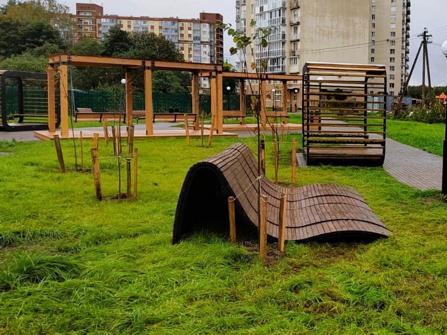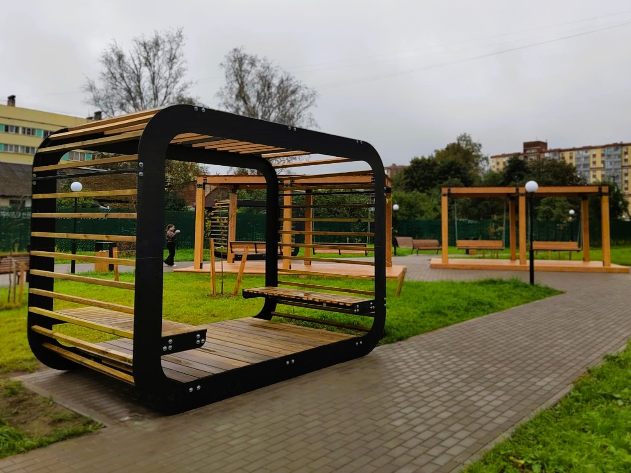 В новом общественном пространстве между амбулаторией и домом 65 по улице Военный городок обустроили сеть дорожек и освещение, кроме того появились удобные скамейки, урны, велопарковка, два навеса с качелями, парковые лежаки «Волна» и две беседки «Атмосфера». Озеленение новой территории представлено липами, яблонями, рябиной и другими цветущими растениями.