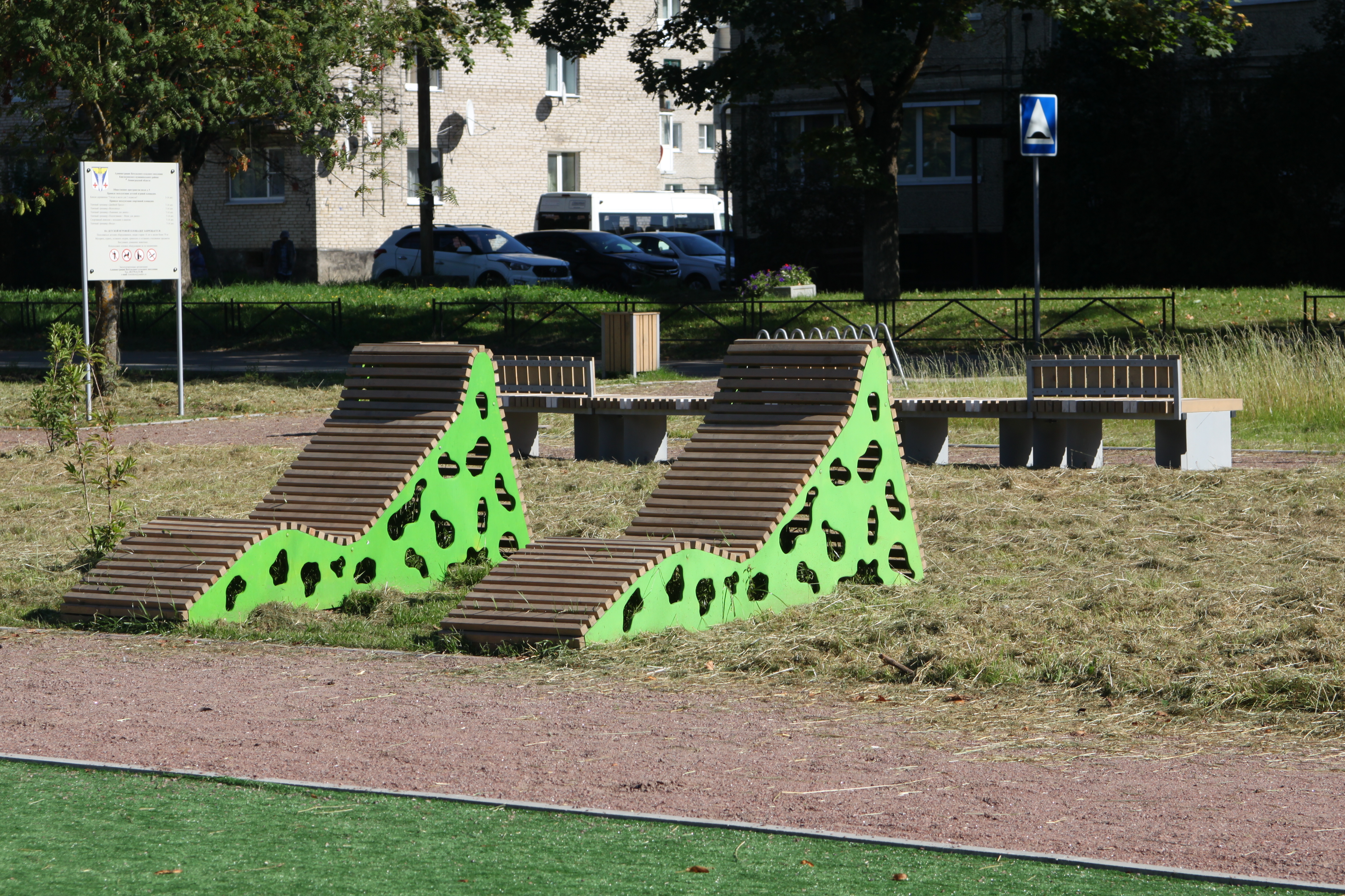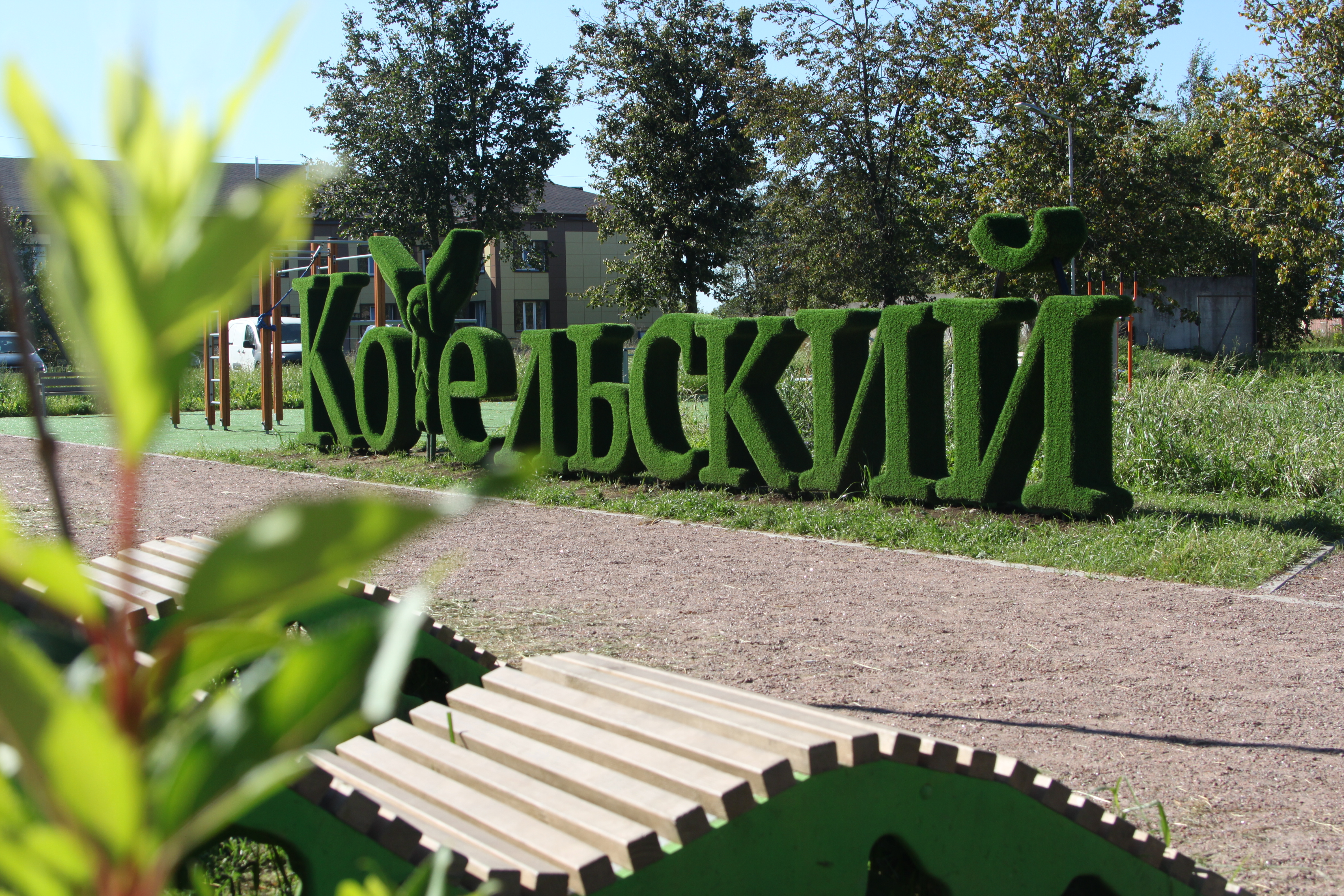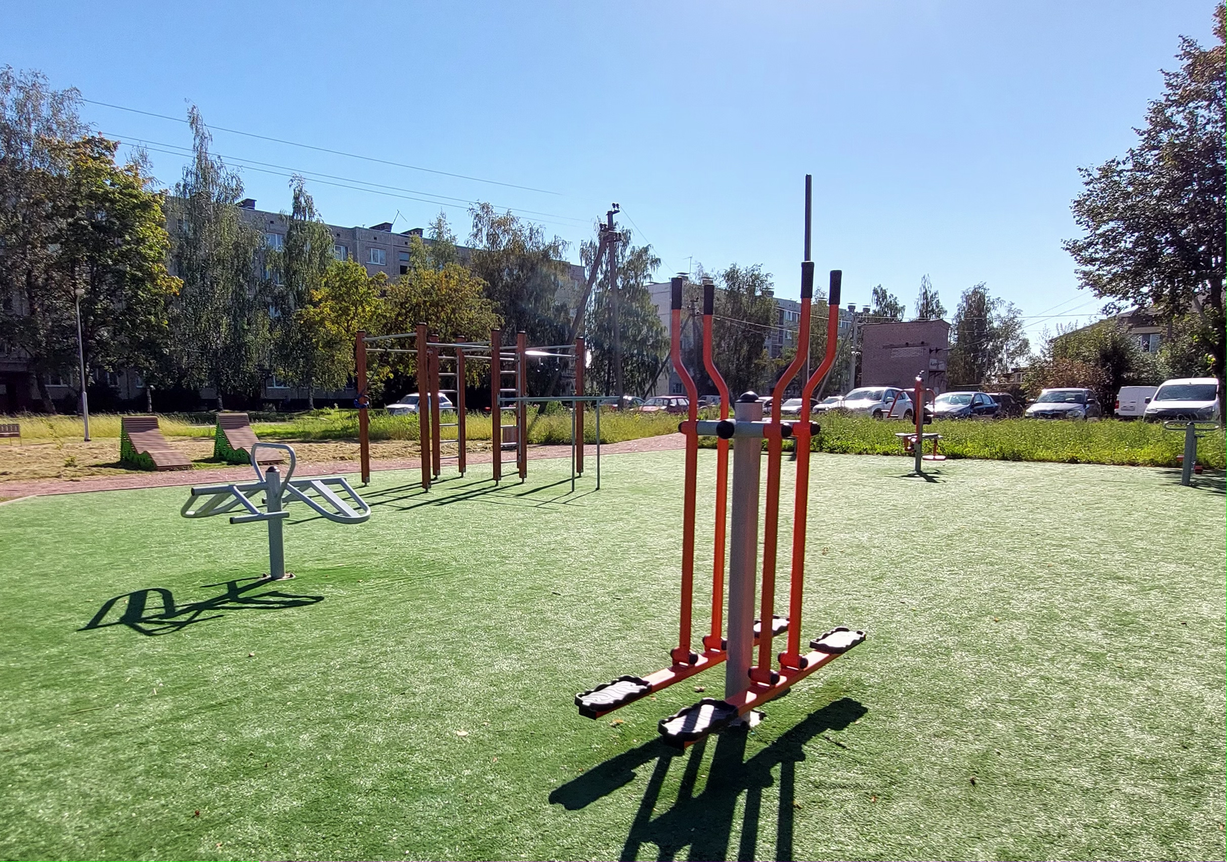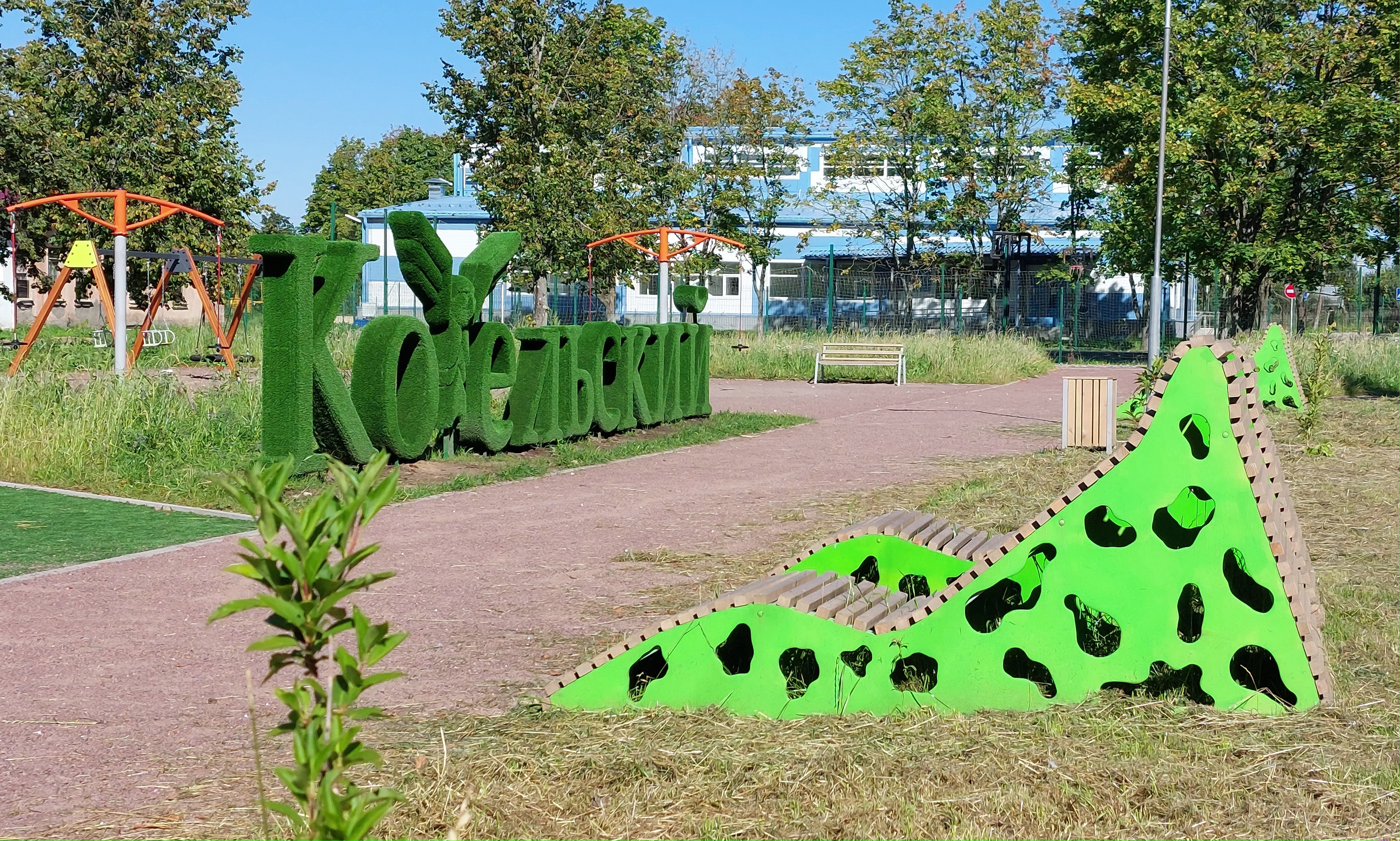 На спортивной площадке предусматривается размещение уличных тренажеров, спортивных комплексов и турников. Спортивная зона проектируется на искусственном газоне. Разделяет между собой детскую и спортивную зону «зеленый островок», представляющий собой зоны для фотографирования - знак «Котельский» и цветник с посадками.