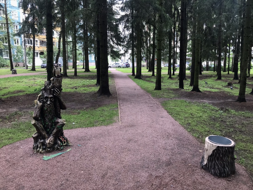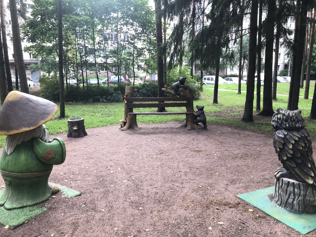 Небольшой сквер преобразился благодаря созданию удобных тропинок для прогулок и уютных лавочек для отдыха. В дополнение к этому на территории установлены арт-объекты с персонажами из русских сказок, что придает месту особую атмосферу и делает его привлекательным для посетителей всех возрастов.