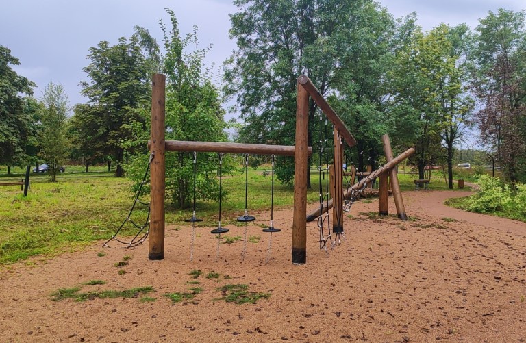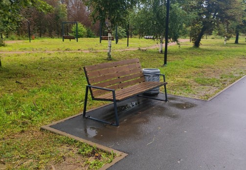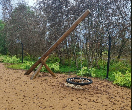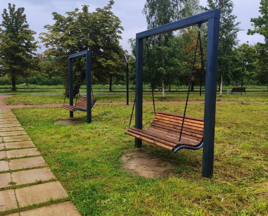 Появилось новое современное пространство с транзитными путями, лавочками и урнами, качелями.