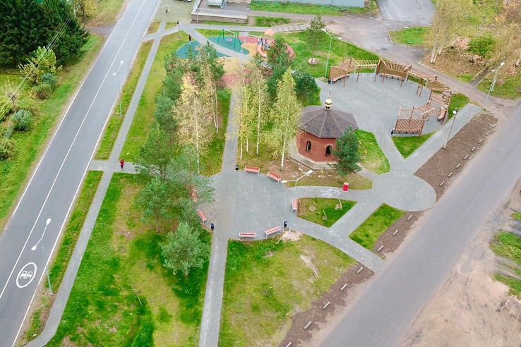 В рамках нацпроекта здесь благоустроен сквер — детские площадки и пешеходные зоны соседствуют с экопарковкой. Здесь создана удобная пешеходная зона, установлена детская игровая площадка и тренажеры для фитнеса. Местные жители уже оценили изящные деревянные перголы с качелями и скамейками для отдыха, экопарковку и озеленение.