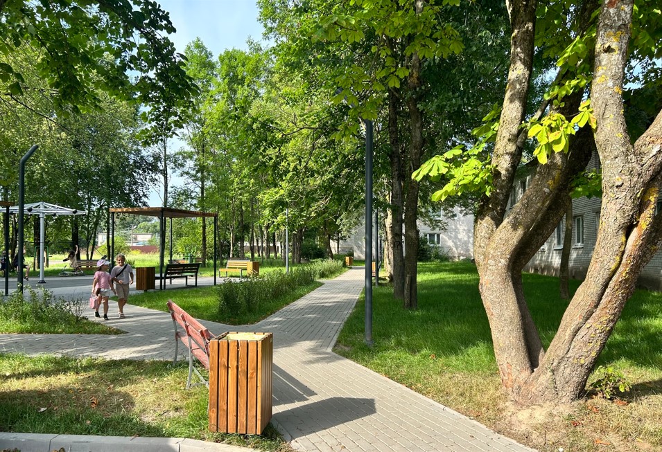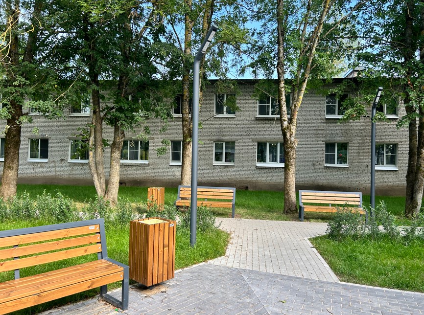 Благоустроенная территория включитла в себя устройство пешеходной сети с учетом ранее существующих транзитных путей; организована рекреационная, спортивная и детская зоны. Сквер оборудован МАФ, освещением. Посеян газон, высажен кизильник, сохранены ранее растущие на данной территории деревья.