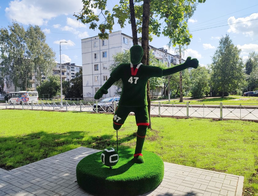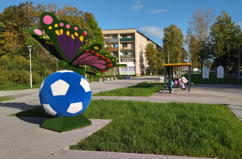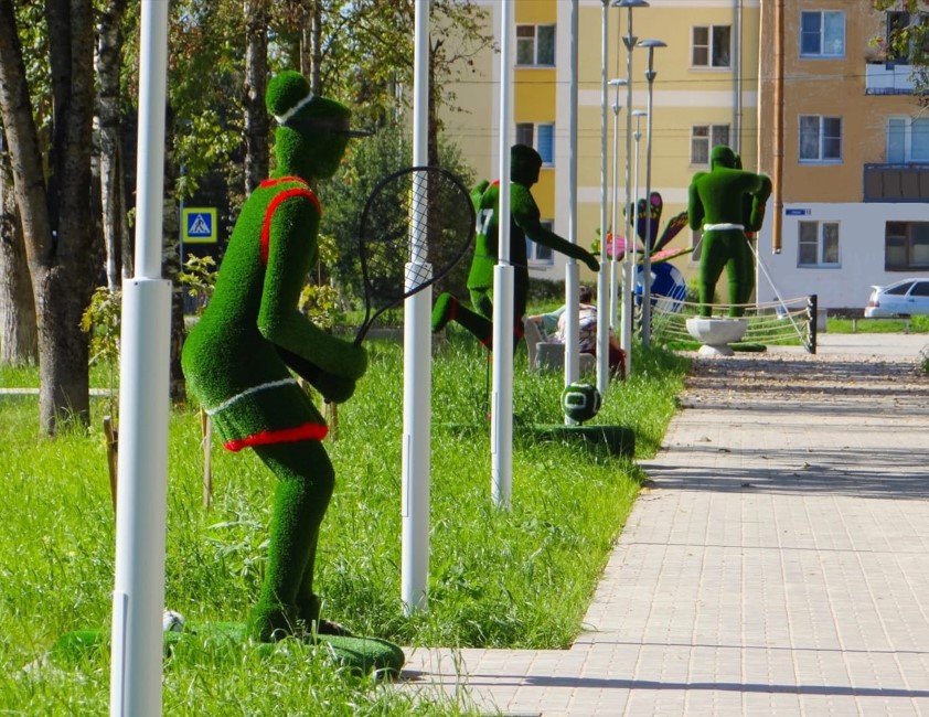 На территории установлены перголы-качели; спортивные арт-объекты - футболист, волейболист, теннисистка, боксеры, бабочка на футбольном мяче; малые архитектурные формы - скамейки, урны, вазоны. Обустроено освещение с энергосберегающими светильниками.