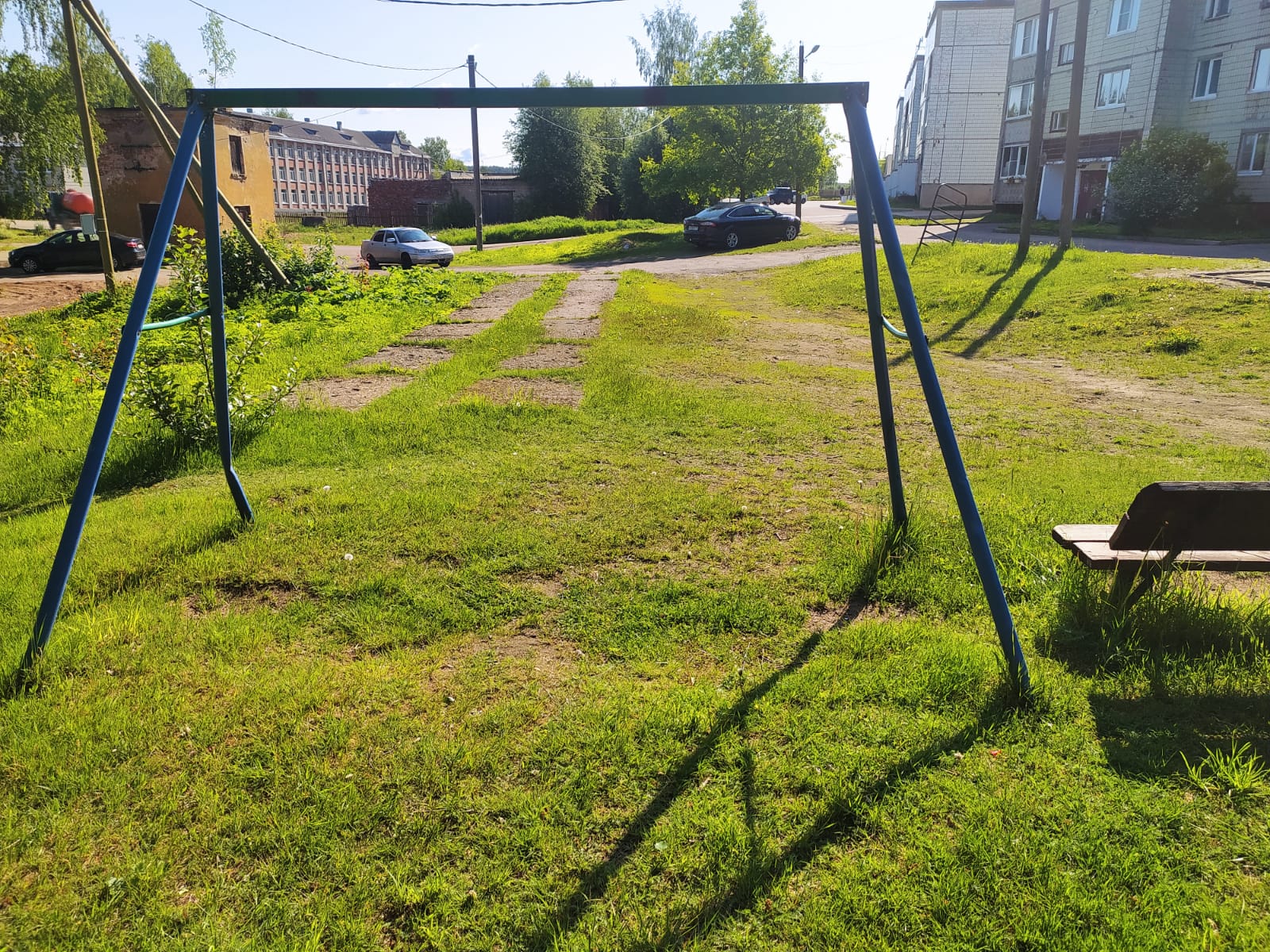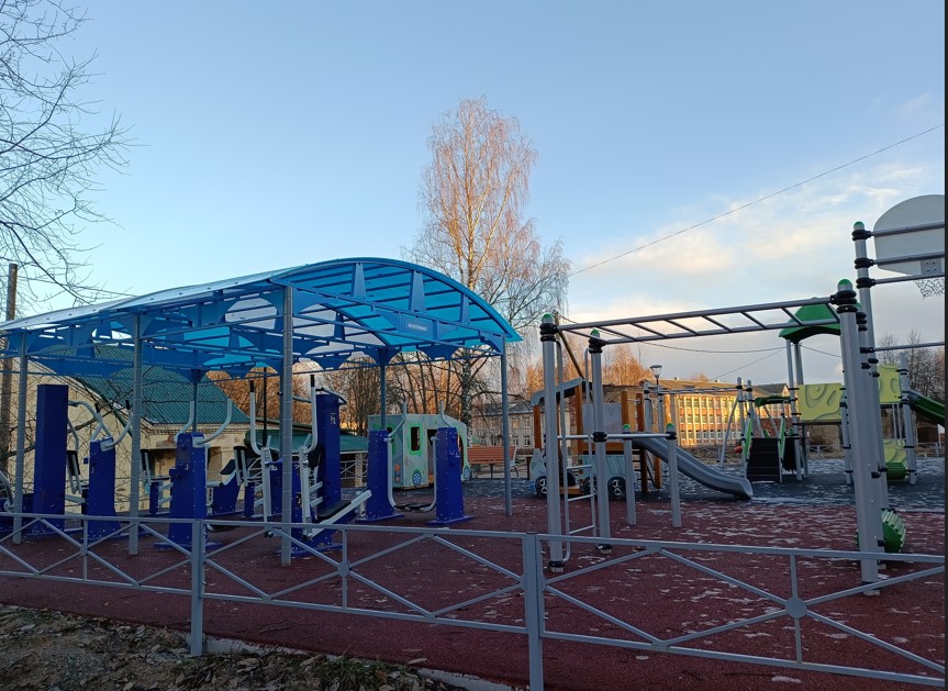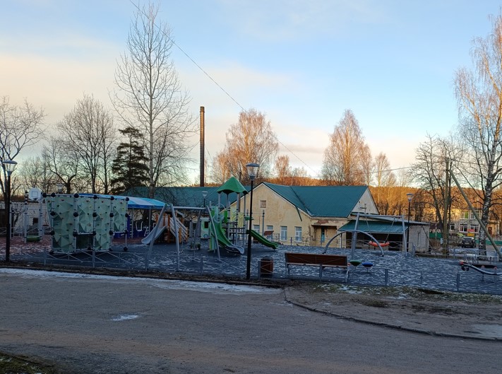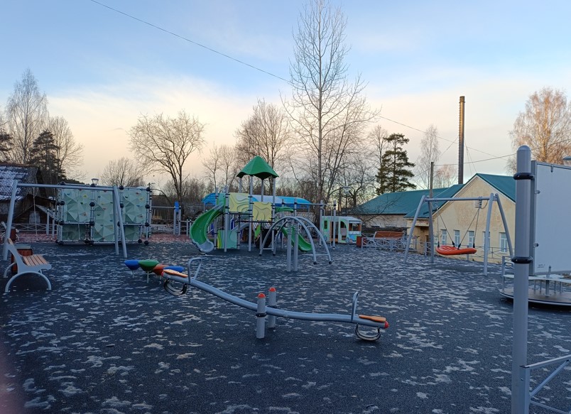 В рамках благоустройства было выполнено несколько важных работ: уложено резиновое покрытие, брусчатка, установлены металлические пешеходные ограждения, светильники и засеян газон.