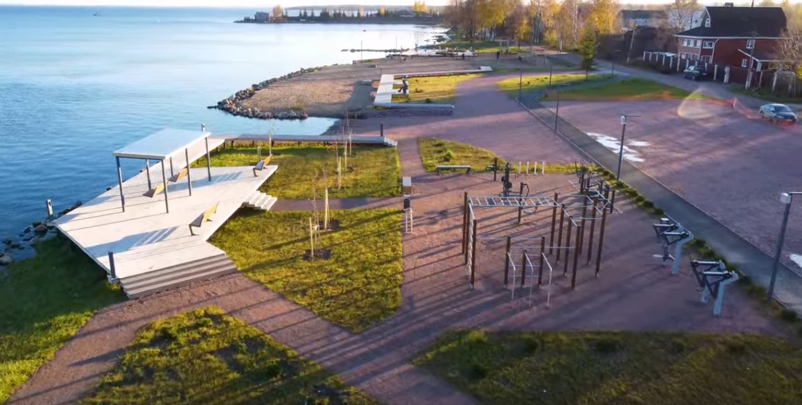 Территория уже радует глаз прекрасно обустроенными зонами отдыха и активности, включая стильную сцену для мероприятий. Здесь также установлены комфортные качели и современное спортивное оборудование, создающее идеальные условия для активного времяпрепровождения.
