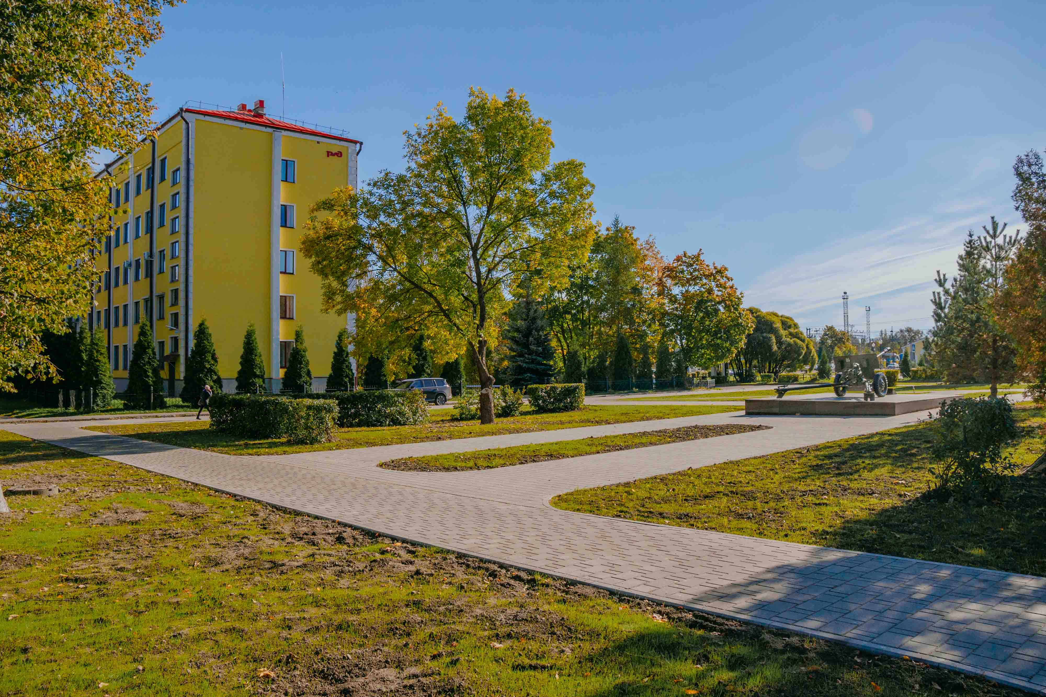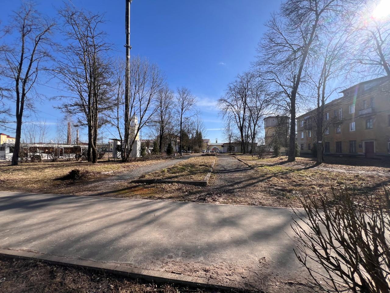 2. Привокзальная зона представлена двумя основный зонами: фотозона (приглашающая на территорию) с размещенным на ней памятником с подсветкой и зона отдыха (ожидания поезда). В рамках внедрения железнодорожной тематики на территорию проектирования предлагается создать мощение, орнаментом отсылащееся к железнодорожным путям, информационных стендов. Территория оснащена большим количеством фонарей, а также приствольной подсветкой вокруг деревьев вдоль основной аллеи.