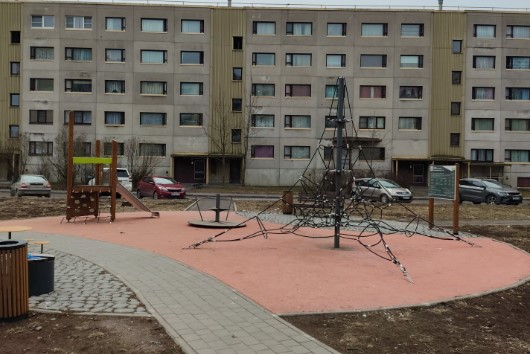 На улице Красноармейская оборудована современная детская площадка с резиновым безопасным покрытием, что обеспечивает безопасность и комфорт для детей. Это место стало популярным и удобным для семейного отдыха и активных игр.